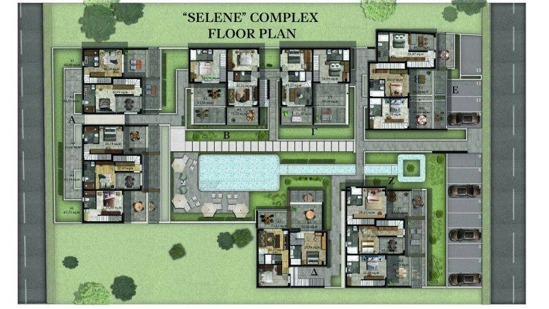 • 14 Maisonettes, 61.40 m², consisting of a living room with kitchen, 2 bedrooms, and 2 bathrooms.