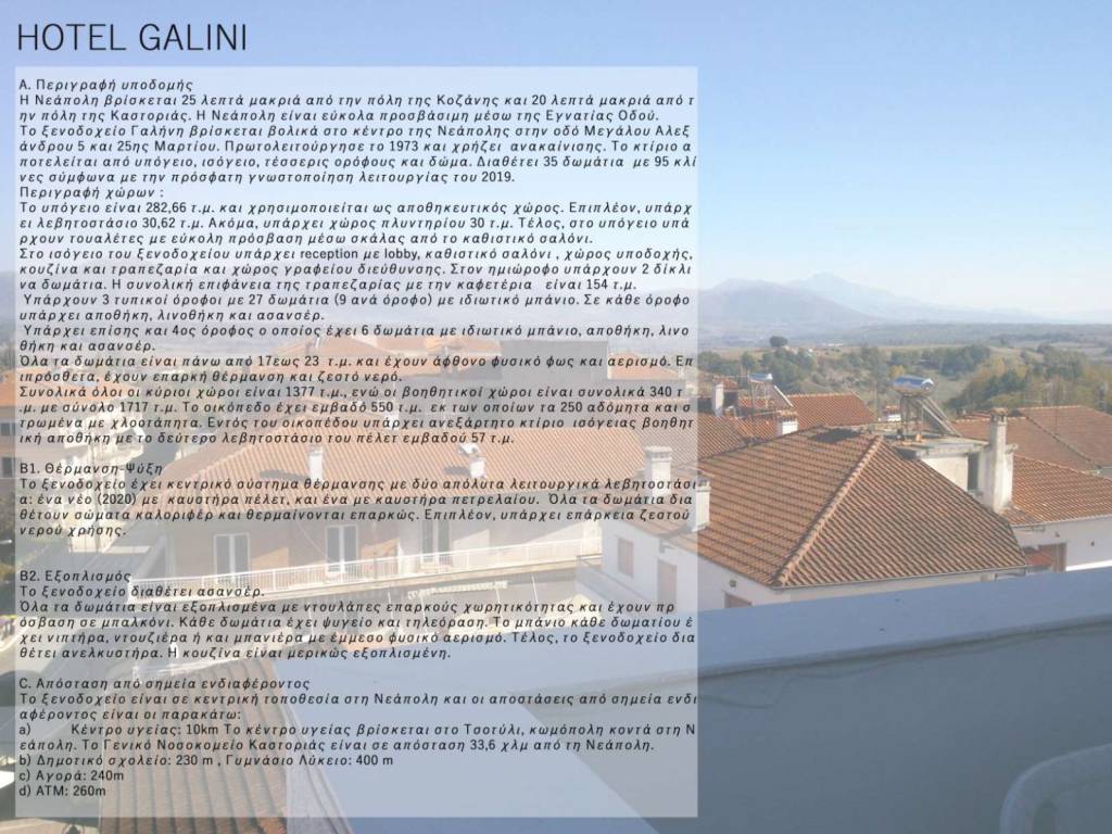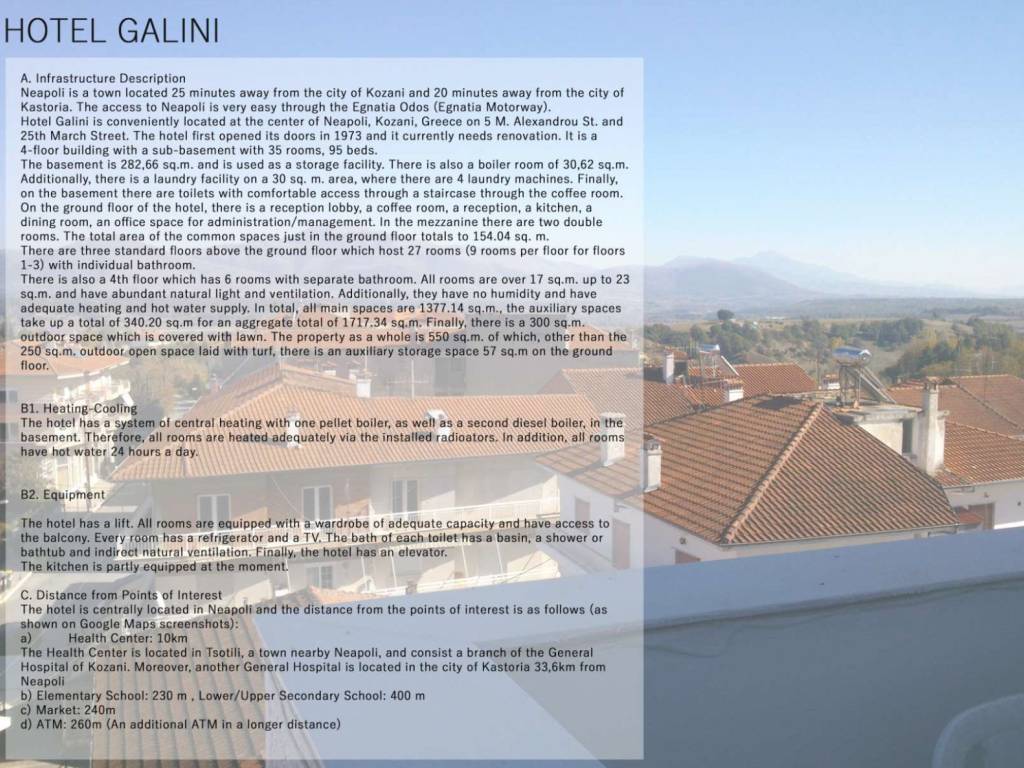 Η Νεάπολη βρίσκεται 25 λεπτά μακριά από την Κοζάνη και 20 λεπτά από την Καστοριά. Εύκολα προσβάσιμη μέσω Εγνατίας οδού. Διαθέτει 35 δωμάτια με δυναμικότητα 95 κλίνες. Αποτελείται από υπόγειο, ισόγειο, 4 ορόφους και δώμα-ταράτσα με πανοραμική θέα. Υπάρχει δυνατότητα αλλαγής χρήσης σε κατοικίες/γραφεία ή άλλη επαγγελματική χρήση και σύσταση οριζόντιων ιδιοκτησιών. Περιγραφή Χώρων: Υπόγειο: 282.66 τ.μ. (βοηθητικοί χώροι: τουαλέτες, αποθήκη, αποδυτήρια, λεβητοστάσιο, πλυντήρια, ) Ισόγειο: 282,66 τ.μ. (κύριοι χώροι: reception, lobby, κουζίνα, εστιατόριο, 2 δωμάτια στον ημιώροφο) 1ος όροφος: 282,66 τ.μ. (κύριοι χώροι: 9 δωμάτια) 2ος όροφος: 282,66 τ.μ. (κύριοι χώροι: 9 δωμάτια) 3ος όροφος: 282,66 (κύριοι χώροι: 9 δωμάτια) 4ος όροφος: 208,88 τ.μ. (κύριοι χώροι: 6 δωμάτια) Απόληξη κλιμακοστασίου: 37,62 τ.μ. (μηχανοστάσιο ανελκυστήρα, αποθήκη δώματος) Ανεξάρτητη ισόγεια επαγγελματική αποθήκη: 57,54 τ.μ. με Υπόγειο Λεβητοστάσιο: 13,63 τ.μ. E(κύριοι χώροι)= 1397,06 τ.μ. Ε(βοηθητικοί)= 347,54 τ.μ.