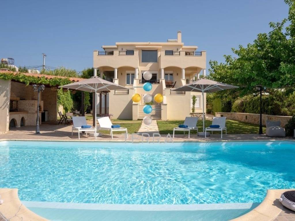 Property Code: 1358606, For Sale Villa, Rethymno ,Violi Charaki 350sq.m ,Ground floor , 15 rooms ,3 level/s ,6 Bedroom/s ,4 bath/s , 2 parking , 2008 built year , features: Security door, Storage room, Fireplace, Internal Staircase, Double Glazed Windows, Balconies, Pets Allowed, Neoclassical, Luxury, Mansion, Bright, AirConditioning, Solar water system, Boiler, Grass, Trees, Swimming pool, Back yard (Garden), Holiday Home, Suitable for Commercial Use, Personal 1 fireplace/s , view :Sea view , distance from: Airport (m): 59000, Seaside (m): 2000, City (m): 3500, price: 1.350.000€