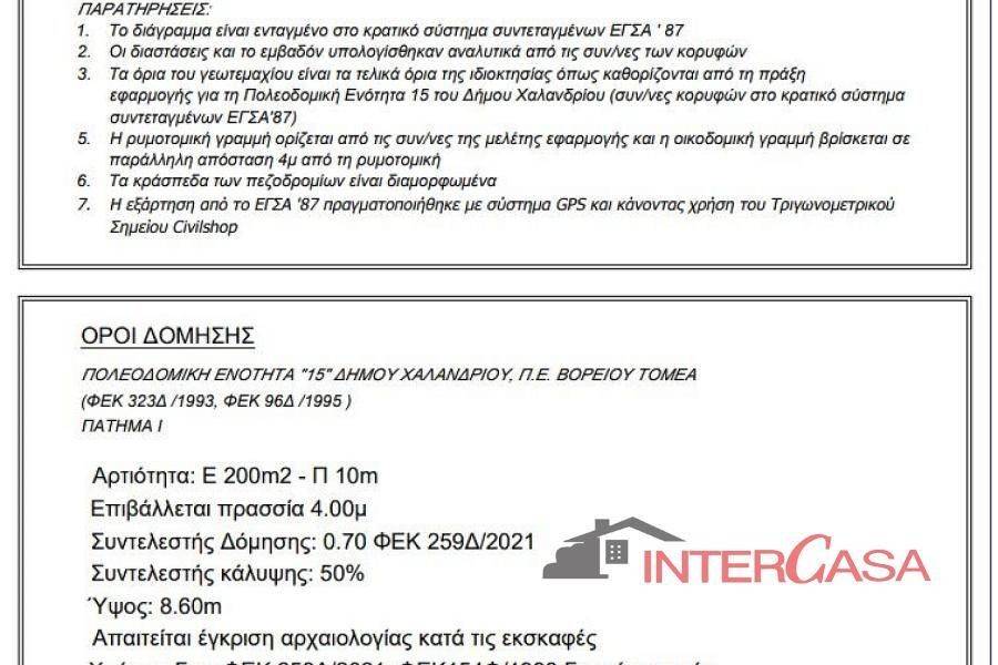Χαλάνδρι Πάτημα , κοντά στο μετρό και στην Αττική Οδό Διαμπερές οικόπεδο 1288 τμ., άρτιο και οικοδομήσιμο. Πρόσοψη 34 μ. στον ένα δρόμο και 29 μ. στον άλλο δρόμο. Συντελεστής δόμησης 0,7 Συντελεστής κάλυψης 50% Ύψος 8.60 m.
