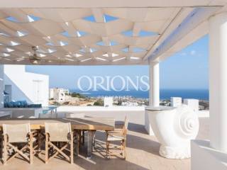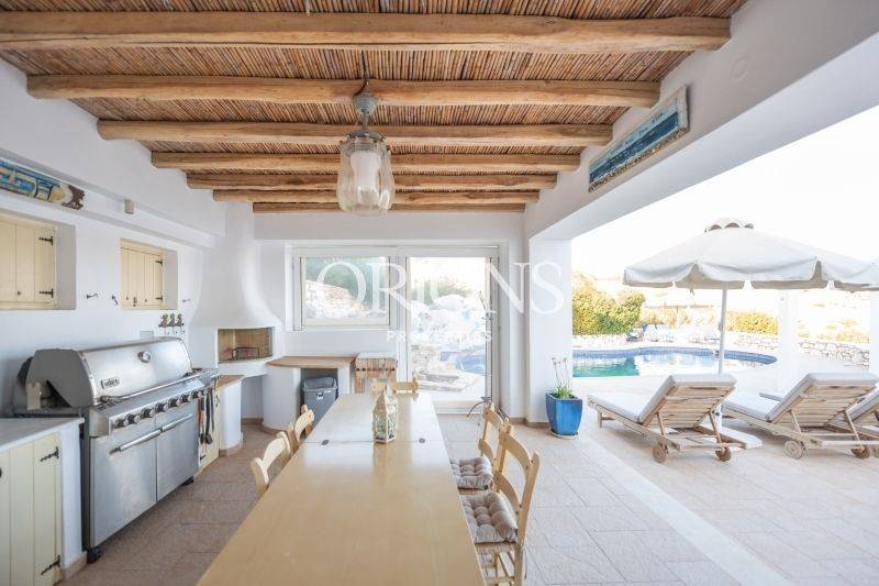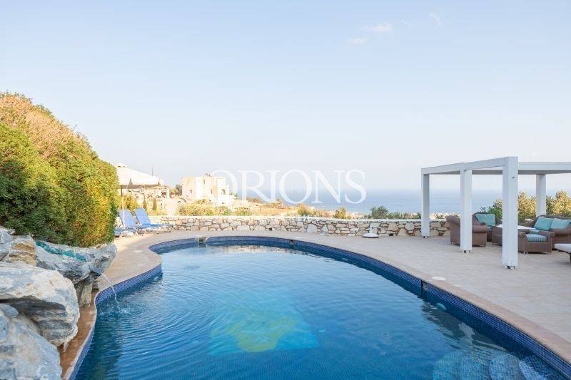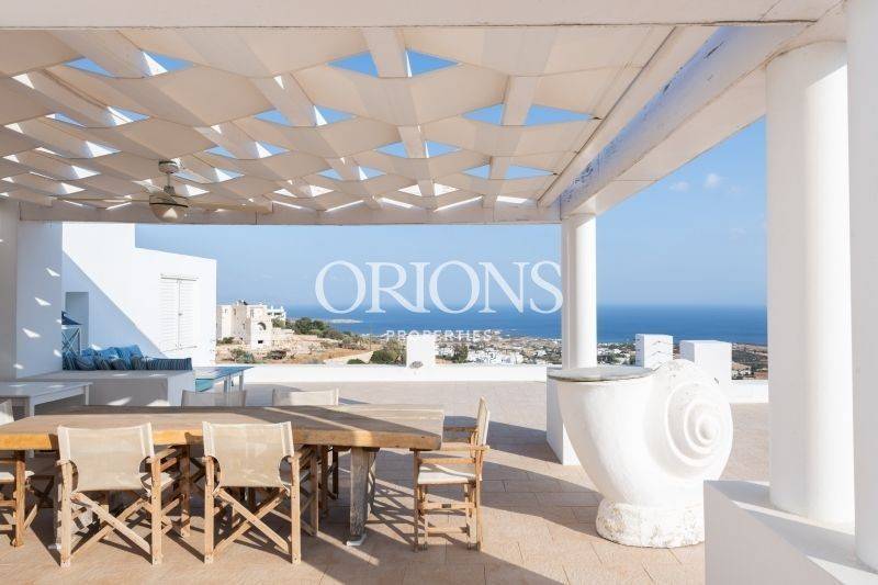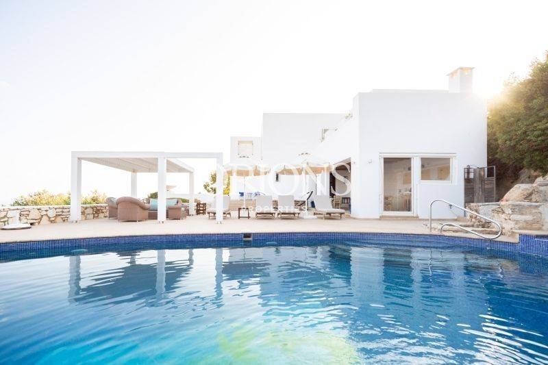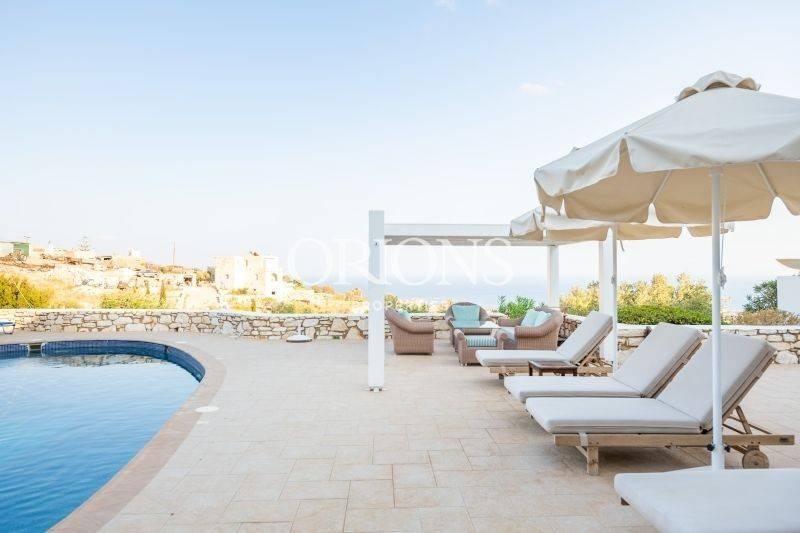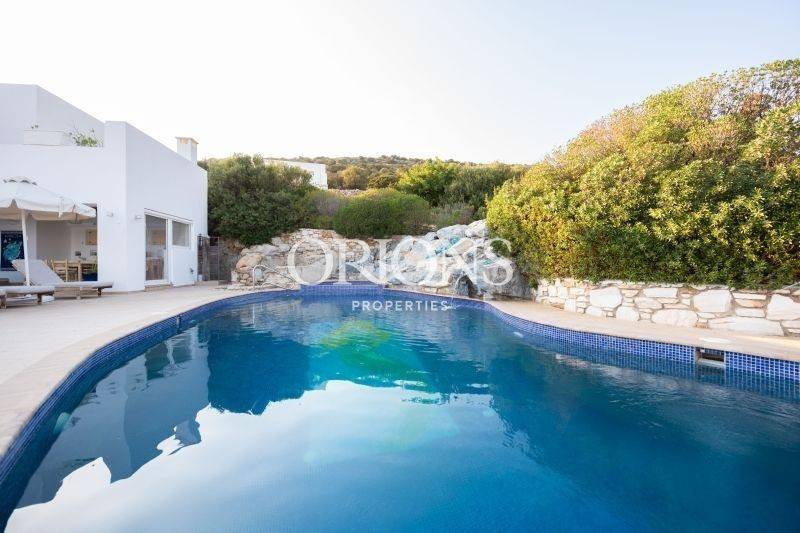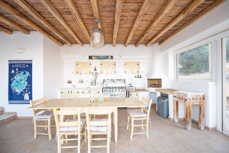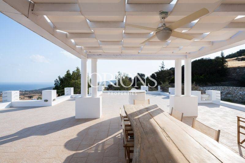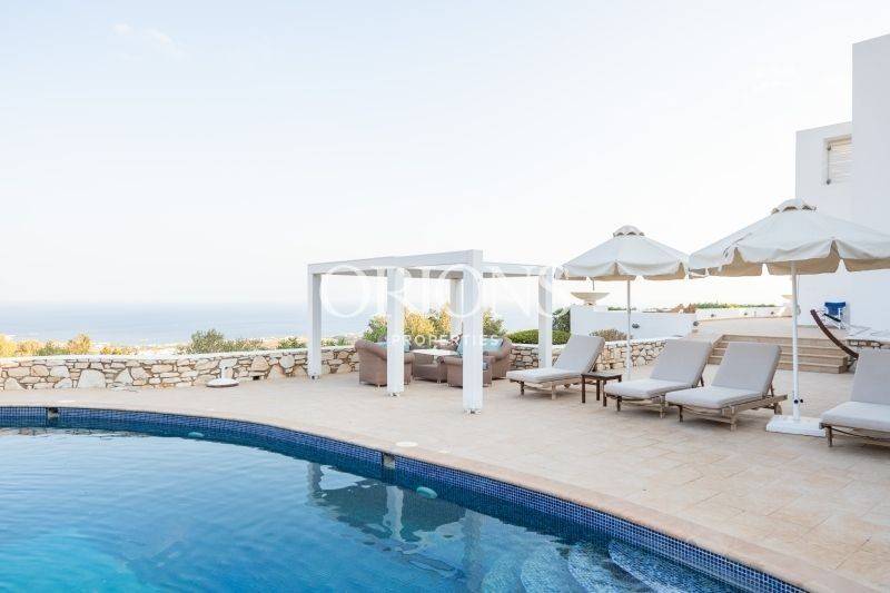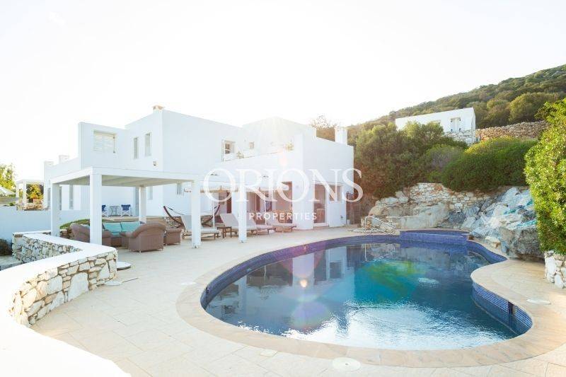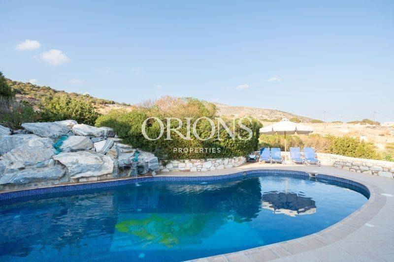 A villa of rare character, this 529 sq.m. residence rises gently above the village of Aspro Chorio, set on more than 8,200 sq.m. of verdant land filled with olive trees. From here, the horizon opens fully to the sea, while the charming village of Drios is just moments away.Designed in traditional Cycladic architecture and completed in 2008, the home unfolds across three levels, seamlessly connected by an internal elevator and a sculptural marble staircase that feels like a piece of art. Inside, the atmosphere speaks of modern luxury, with generous volumes, refined finishes, and a natural flow that connects light, space, and the sun-drenched terraces. The main living and dining area is framed by picture windows that draw the view inward, while a central light fixture and a stone fireplace create a warm, inviting focal point. A fully fitted marble kitchen with sleek countertops and a central island completes the heart of the home, blending functionality with understated elegance.On the lower level, leisure takes center stage with a beautifully designed games room, complete with a billiards table and bar, a relaxed, social space to enjoy with friends and family when not lounging outdoors by the pool.Outside, the villa expresses its full Cycladic charm. Expansive terraces and shaded pergolas invite slow afternoons with the endless blue of the sea as a backdrop. A private outdoor kitchen, complete with professional-grade grills and a generous dining area beneath the pergola, becomes the perfect stage for long summer evenings, filled with food, sea air, and conversation. Three en-suite bedrooms open directly onto this tranquil outdoor world, each offering graceful interiors and its own share of the view.The upper level is dedicated to the primary suite, a serene retreat with its own private terrace, while within the grounds, a detached guesthouse offers complete privacy and independence.The estate is also a living, productive landscape: from about one hundred and fifty of its finest olive trees, over 500 kilograms of olives are typically harvested each year, yielding around 76 kilograms of exceptional extra virgin olive oil, a tangible expression of the land’s richness and the authentic Aegean way of life.The villa is designed for year-round comfort and enjoyment, featuring amenities such as a jacuzzi, dressing room, laundry area, ample storage throughout, as well as three large solar panels that support the hot water system.The location is equally exceptional. Just a short drive away are some of Paros’ most iconic beaches, including Golden Beach, a stretch of fine sand and turquoise water, beloved by swimmers and kite surfers alike. The area combines the energy of the sea with the calm rhythm of village life, offering both adventure and serenity.This is a home that balances tradition with contemporary comfort, privacy with openness. More than just a villa, it is a place to live the Cycladic rhythm, shaded lunches under the pergola, swims in the private pool, cozy evenings by the fire, and long days that unfold between the sea and the garden.