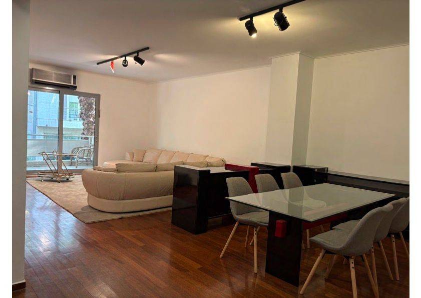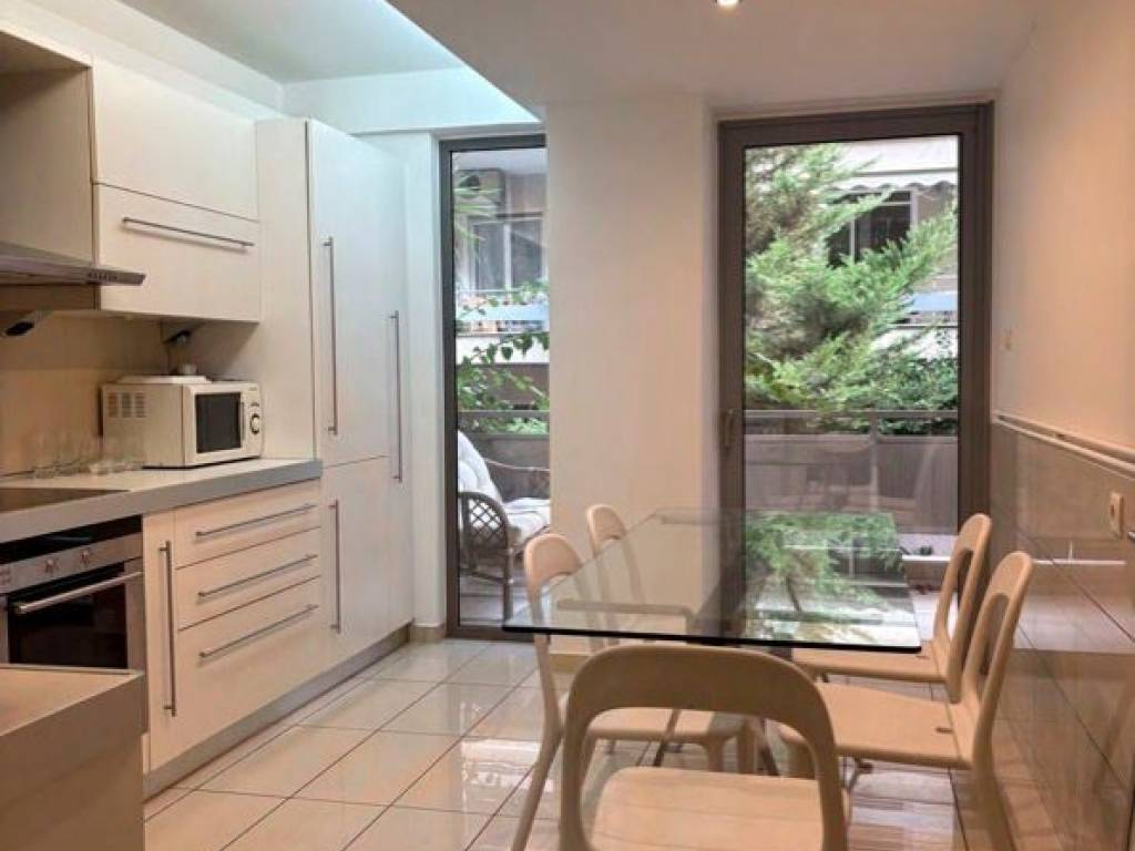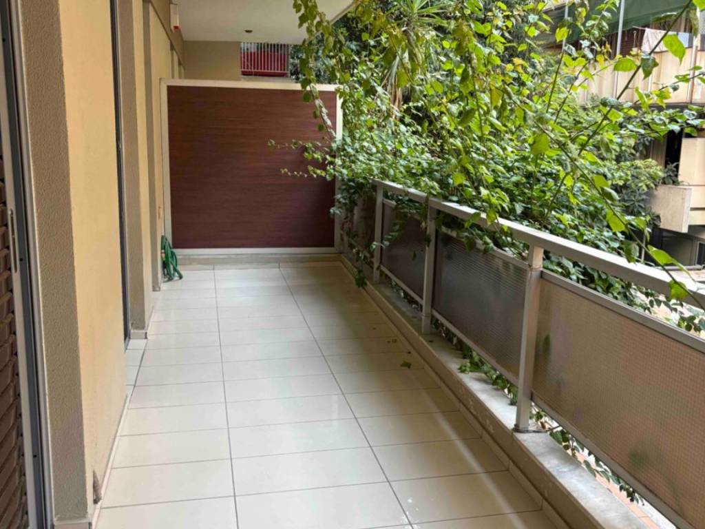This is a 1st floor apartment (114 sq m), renovated in 2025, bright, in a well-maintained, quiet apartment building of a few apartments, two per floor, with the main areas of the apartment on the sidewalk of Arnis Street, with tree-lined front gardens. It is only two minutes from the Megaro Musica Metro station and five minutes from the Hilton Hotel. It can meet the needs of a family of four or even a professional home. The apartment is available fully furnished or semi-furnished depending on the case and is suitable for residence, hosting official guests of embassies and employees. Alternatively, it is also suitable for professional office use as well as for a doctor's office due to its location near hospitals. It has ground floor access to the elevator serving people with disabilities. Inside, it has a large main room (Iroko wooden floors), a fully furnished kitchen with built-in Siemens electrical appliances and a large veranda (12 sq m) on the facade with a small external storage room. It also has two spacious rooms also covered with wooden floors (Iroko), has built-in wardrobes and has access to a balcony. A small utility room/storage room, with a washing machine, is also located within the apartment. The two bathrooms, one spacious with a bathtub and shower, as well as a guest W.C. with a shower, are particularly well equipped, with the ability to serve people with disabilities. The apartment has independent autonomous natural gas heating, as well as air conditioning in all areas. It is classified in energy category C, while, among other things, it has double glazing and screens. It is noted that the apartment building, like the apartment, has security doors.