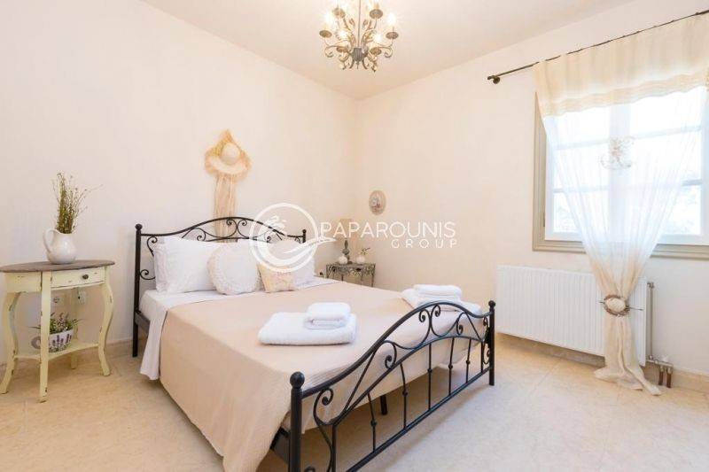 On the first floor of the maisonette, there is a bedroom with a double bed, a second bedroom with two single beds, a bathroom, and a terrace extending from the master bedroom, offering spectacular views of the Saronic Gulf, Spetsopoula, and more.