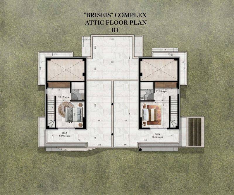 • 8 Floor apartments with an attic 62,06sqm, consisting of a living room with kitchen, 2 bedrooms, 2 bathrooms.