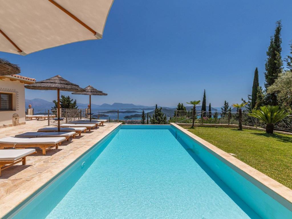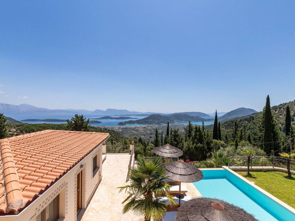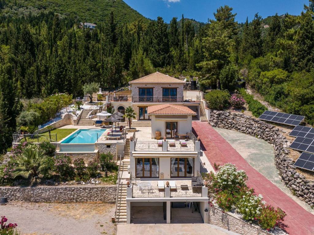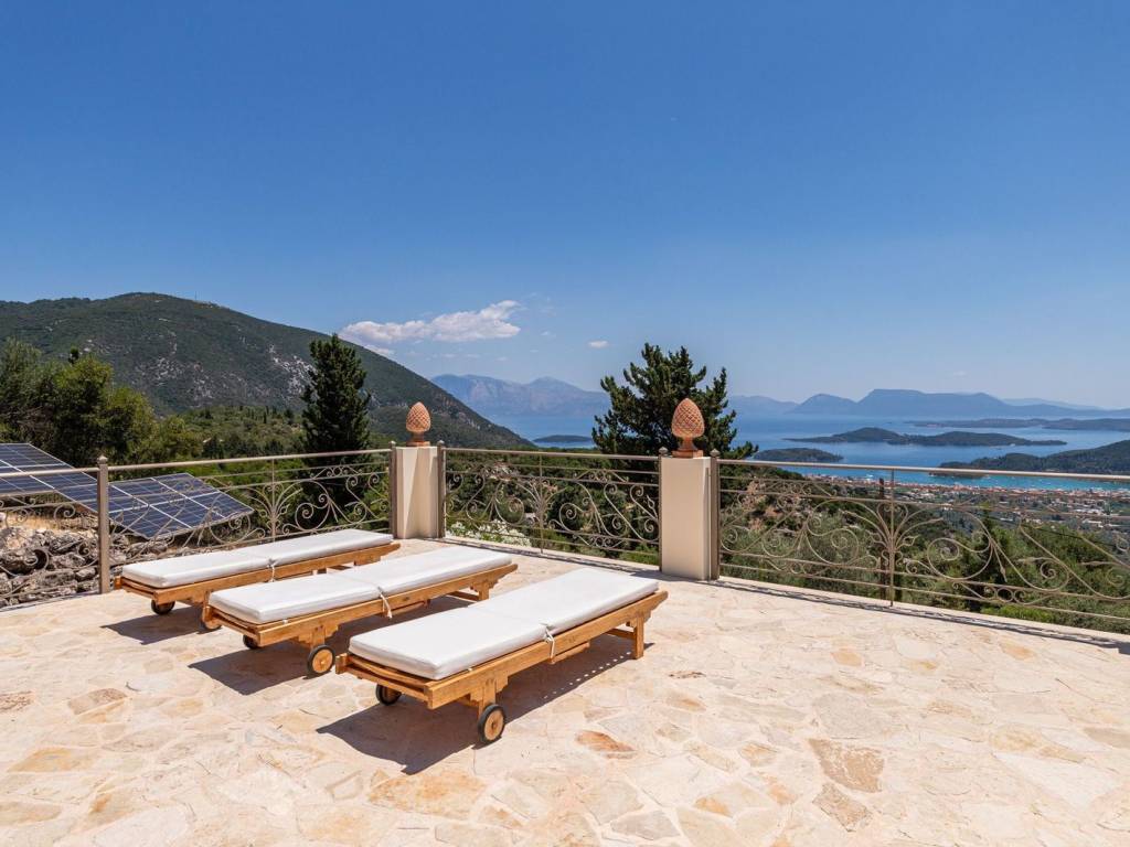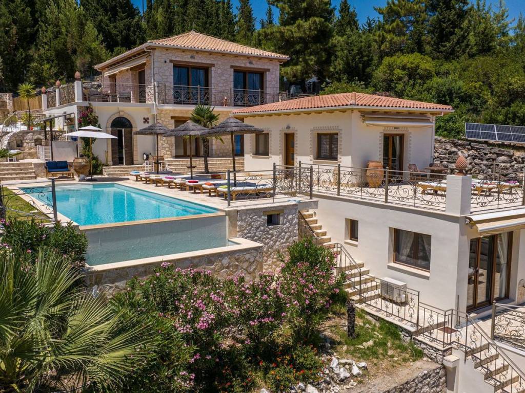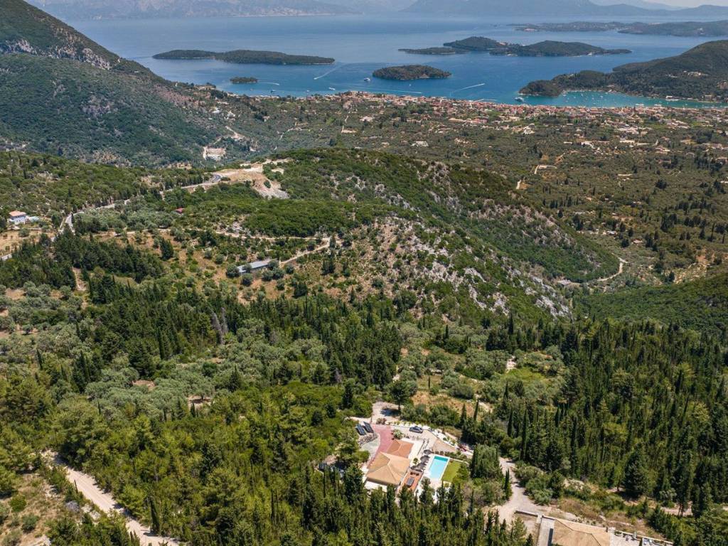 Discover an extraordinary opportunity to own a private hillside estate with commanding views over the sparkling Ionian Sea and the storied islands of Scorpios and Meganisi. Nestled between the charming village of Vafkeri and the lively coastal town of Nidri, this serene retreat is set on 4,000 square meters of beautifully landscaped land, offering unmatched tranquility, privacy, and elegance—just six minutes from the sea. The estate comprises three distinct villas, each thoughtfully designed to blend harmoniously with the natural surroundings while offering maximum comfort, privacy, and breathtaking views. The crown jewel, is a spacious 160 sqm residence with three beautifully appointed bedrooms, three modern bathrooms, and a generous open-plan living area with a fully equipped kitchen. Expansive glass doors lead to a stunning 47 sqm sea-view terrace—ideal for alfresco dining or sunset lounging. The villa features modern amenities such as floor heating, air conditioning, and a central heat pump system for year-round comfort. Adjacent to the main villa, two guest residences offer further accommodation with charm and functionality. 37 sqm 47 sqm, each feature an open-plan living space with kitchen, a tranquil bedroom, private bathroom, and their own 47 sqm terraces. Both are perfect for hosting guests, extended family, or generating premium rental income. At the heart of the estate lies a spectacular infinity pool (10 x 4.2 m) that appears to spill into the Ionian Sea, flanked by sun-kissed terraces that can accommodate up to 14 loungers. The outdoor experience is elevated with a dedicated pool bar and barbecue area, inviting leisurely afternoons and candlelit evenings under the stars. Surrounded by vibrant Mediterranean and exotic plantings, the grounds offer the perfect backdrop for relaxation or entertaining. Additional amenities include a large storage room (47 sqm), a smaller utility space (6 sqm), a solar hot water system, and ample private parking. Whether you're seeking a luxurious private residence, a boutique rental venture, or a unique investment in one of Greece’s most sought-after locations, this exceptional Lefkada estate delivers unparalleled lifestyle and income potential. It is more than a home—it is a place where unforgettable memories are made. Lefkada is one of the few Greek islands accessible by car, enhancing both accessibility and demand. Known for its stunning beaches and growing tourism sector, it attracts buyers seeking holiday homes, boutique hotels, and premium land plots. The real estate market offers a range of opportunities, from renovating traditional houses to developing luxury villas with high rental yields. Its strategic location places it near Preveza, Paxos, and Kefalonia, making it a valuable hub in the Ionian region.