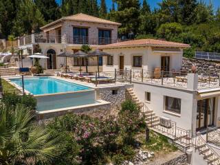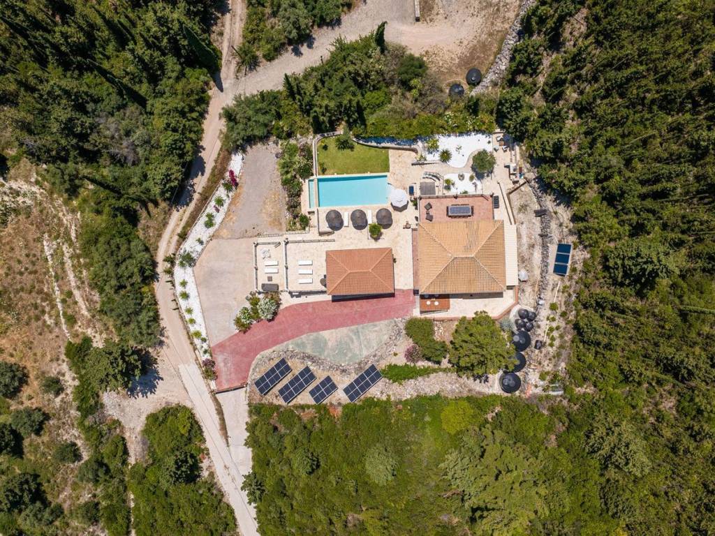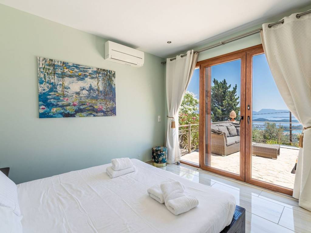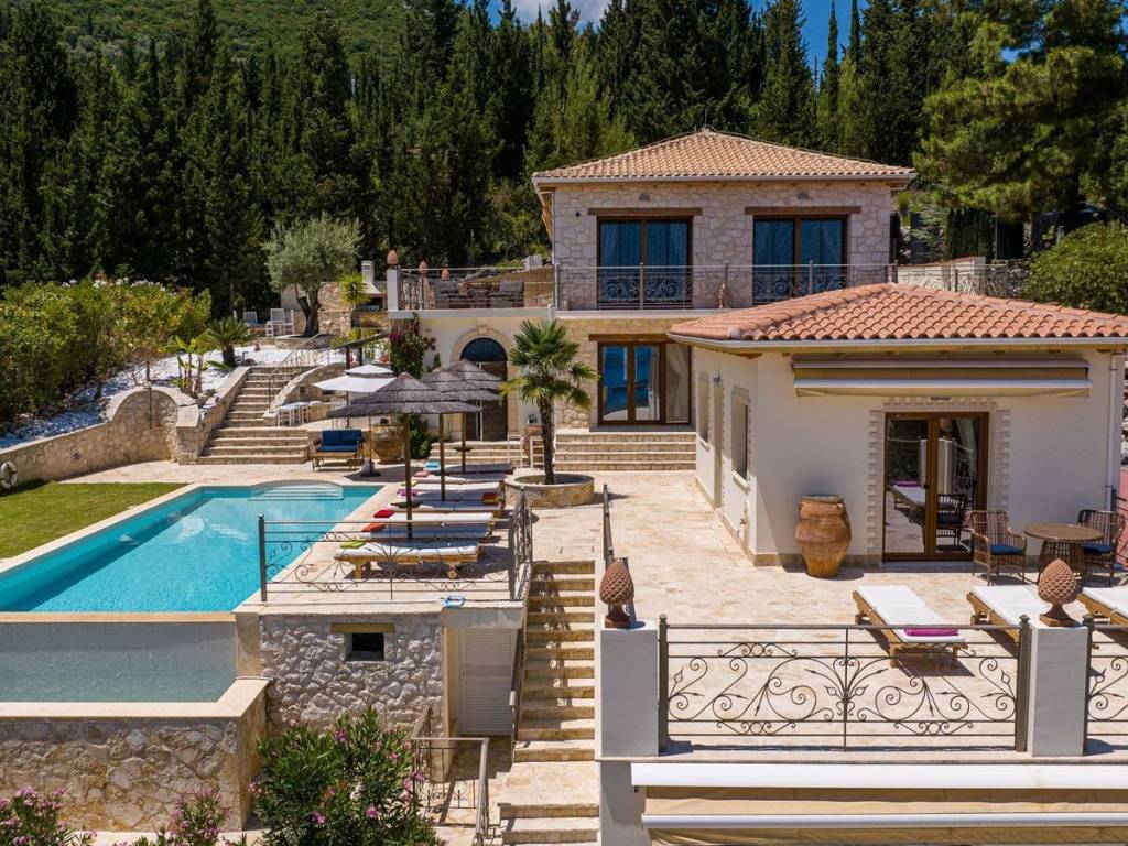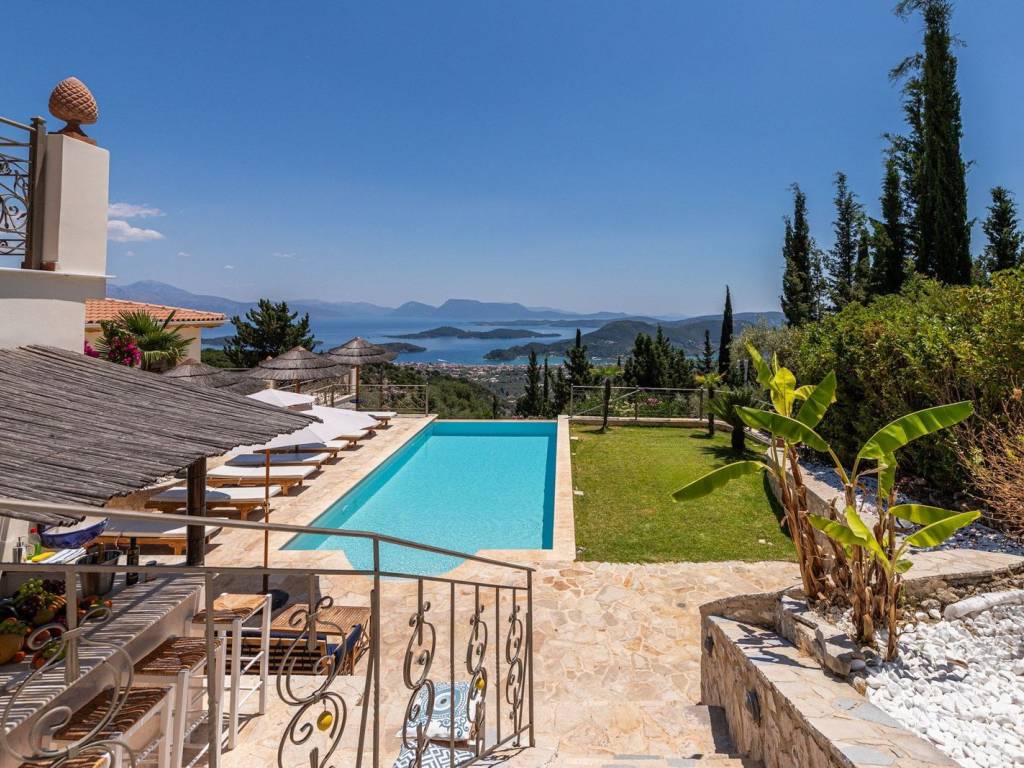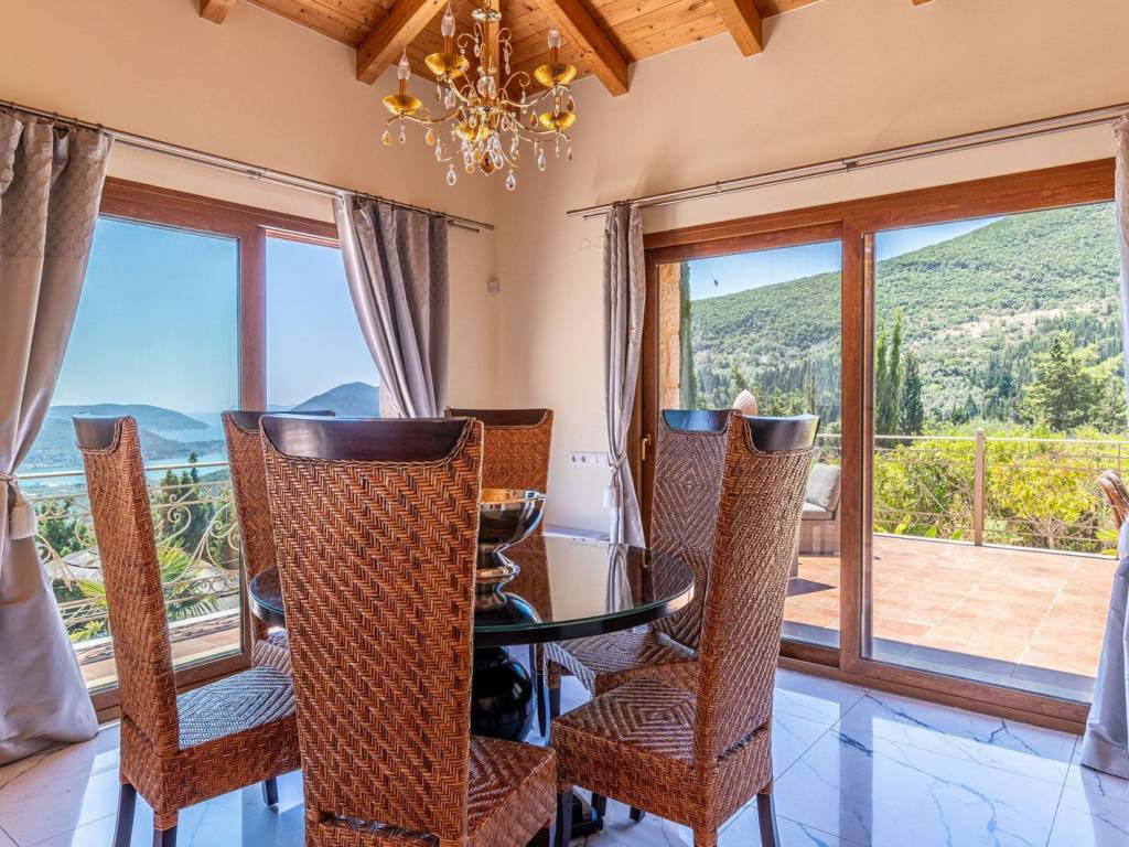 Discover an extraordinary opportunity to own a private hillside estate with commanding views over the sparkling Ionian Sea and the storied islands of Scorpios and Meganisi. Nestled between the charming village of Vafkeri and the lively coastal town of Nidri, this serene retreat is set on 4,000 square meters of beautifully landscaped land, offering unmatched tranquility, privacy, and elegance—just six minutes from the sea. The estate comprises three distinct villas, each thoughtfully designed to blend harmoniously with the natural surroundings while offering maximum comfort, privacy, and breathtaking views. The crown jewel, is a spacious 160 sqm residence with three beautifully appointed bedrooms, three modern bathrooms, and a generous open-plan living area with a fully equipped kitchen. Expansive glass doors lead to a stunning 47 sqm sea-view terrace—ideal for alfresco dining or sunset lounging. The villa features modern amenities such as floor heating, air conditioning, and a central heat pump system for year-round comfort. Adjacent to the main villa, two guest residences offer further accommodation with charm and functionality. 37 sqm 47 sqm, each feature an open-plan living space with kitchen, a tranquil bedroom, private bathroom, and their own 47 sqm terraces. Both are perfect for hosting guests, extended family, or generating premium rental income. At the heart of the estate lies a spectacular infinity pool (10 x 4.2 m) that appears to spill into the Ionian Sea, flanked by sun-kissed terraces that can accommodate up to 14 loungers. The outdoor experience is elevated with a dedicated pool bar and barbecue area, inviting leisurely afternoons and candlelit evenings under the stars. Surrounded by vibrant Mediterranean and exotic plantings, the grounds offer the perfect backdrop for relaxation or entertaining. Additional amenities include a large storage room (47 sqm), a smaller utility space (6 sqm), a solar hot water system, and ample private parking. Whether you're seeking a luxurious private residence, a boutique rental venture, or a unique investment in one of Greece’s most sought-after locations, this exceptional Lefkada estate delivers unparalleled lifestyle and income potential. It is more than a home—it is a place where unforgettable memories are made. Lefkada is one of the few Greek islands accessible by car, enhancing both accessibility and demand. Known for its stunning beaches and growing tourism sector, it attracts buyers seeking holiday homes, boutique hotels, and premium land plots. The real estate market offers a range of opportunities, from renovating traditional houses to developing luxury villas with high rental yields. Its strategic location places it near Preveza, Paxos, and Kefalonia, making it a valuable hub in the Ionian region.