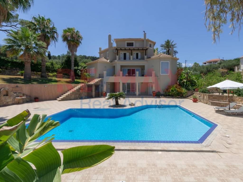For sale: a unique luxury villa located in Bochali, Zakynthos, on a 2,585 sq.m. plot within the town planning zone, just 1.5 km from Zakynthos town and 2 km from the sea. The property features an 80-meter frontage on the main Zakynthos–Bochali road and is fully enclosed by a beautifully crafted stone wall. The residence, with a total area of approximately 600 sq.m., is developed over four levels and offers unobstructed views, complete privacy, and exceptional construction quality. The plot includes a 71 sq.m. swimming pool with independent water tank and engine room, exterior WC, storage areas, BBQ facilities, garden storage, dog house, landscaped gardens and orchard arranged in multiple elevation levels. A 7-meter-deep well with a 4-meter diameter ensures full irrigation autonomy through an automatic underground pipeline system. The house is organized into four floors. The first level, 196.32 sq.m., includes two bedrooms, an open-plan kitchen–dining–living area with fireplace, bathroom, storage room, garage, engine room, water tank, and a covered veranda, and has an independent entrance. The second level, 181.62 sq.m., serves as the main entrance and features a kitchen and a large open-plan space consisting of dining area, living room, office with fireplace, second living room with fireplace, WC, and both covered and open verandas. The third level, 140.76 sq.m., offers a sitting area, three bedrooms, two bathrooms, a dressing room, balconies and spacious verandas. The fourth level, a 73.18 sq.m. attic, includes an open-plan area, bathroom and veranda. The villa features autonomous underfloor heating, alarm system, fireplaces, PVC or aluminum frames with double glazing, tiled floors, built-in wardrobes, air conditioning, solar water heater, satellite dish, awnings, insect screens, security door, accessibility for people with reduced mobility, playroom, and an internal staircase connecting all levels. The exterior spaces provide excellent privacy and significant potential for further landscaping. Constructed in 2004, the property holds an energy certificate class A. RE/MAX Real Advisor, contact phone: 2155550611, email: remax.real.advisor@gmail.com, website: