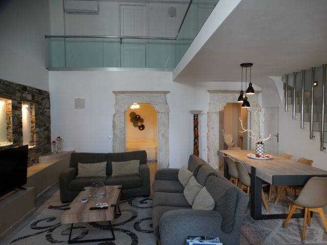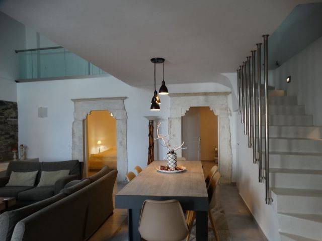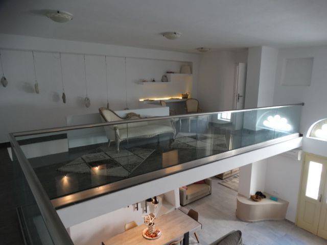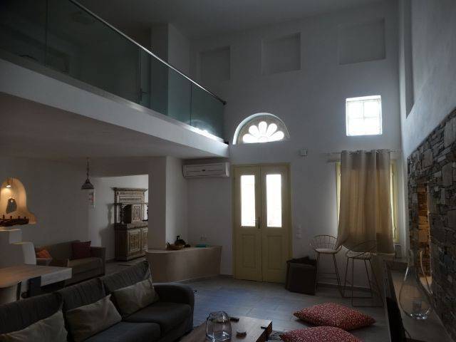 CITY OF TINOS (CHORA) – A 2 LEVEL HOUSE OF A TOTAL AREA 195sqm. WITH AN UNOBSTRUCTED VIEW TO THE SEA AND THE PORT. In a privileged location in the City of TINOS (Chora) , with an unobstructed views to the sea and the Main Port, a Double Floor House having a total surface area of 195sqm., enjoying 2 Bedrooms and 2 full Bathrooms. In detail, the House internally and above the Living Room has a shaped balcony – corridor, creating a high-ceilinged space that distributes and at the same time functionally connects the 2 levels. The Entrance of the House has a spacious 20sqm Courtyard with a view of the sea. On this Main Level is the Living Room with the Dining area, the autonomous Kitchen having an access to the yard and a large Bedroom with the Bathroom. The staircase by the side of the Living room, leads to the internal veranda – corridor of the Upper Floor, overlooking the Living Room from above. On this level there is the 2nd Bedroom with a balcony and space for an Office or a small TV Lounge. In addition, on this Upper Floor level, there is the Bathroom and the Washer - Dryer Area as well as an exit to a small yard at the back of the property. The House is perfectly constructed with all the amenities for a modern residence having all its utilities connected - ready to move into.