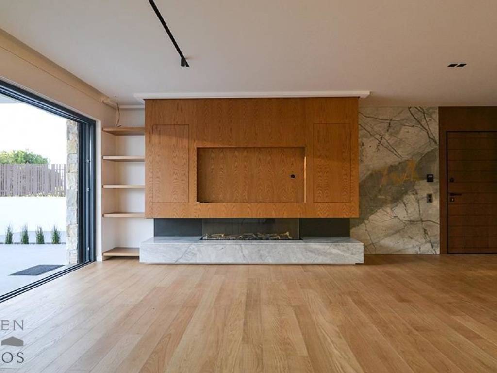 This brand-new villa represents a modern expression of a hotel-like living as envisioned and realized by Block722 Architects+, with a long-lasting history in hotel design and construction. It is a property of high aesthetics and unique architecture reminiscent of an island villa. The construction of the villa was completed at the beginning of 2021. The house elevates on 4 levels of total 470sqm, of which 350sqm are primary spaces and 120sqm auxiliary spaces, and expands on a 400sqm plot with a perimetric garden which surrounds the property. As soon as you walk inside the property you are awed by the appearance of the mosaic rock walls along the alley leading to the main wooden entrance. As soon as you walk inside, you feel a sense of serenity by all the natural colors; the flooring and the majority of the decorations and furniture are wooden, with touches of white marble-like granite. On the ground floor there is a spacious living room area with a gas-powered fireplace, the guest WC and an open-space kitchen with a small dining area with access to the BBQ area outside. The access to all other floors is either through the wooden staircase or the elevator; proceeding to the lower floor (-1) there is a huge open-space area that can be used as a cinema room, a play room or any other way possible, showered with light from the window towards the pool offering a mesmerizing light blue hue. There is also a separate bedroom with a skylight, a bathroom and a separate room to be used as a laundry area; from this floor, there is also access to the underground garage suitable for 4 or 5 cars (depending on size). Proceeding to the 1st floor, this is the area where the main bedrooms are actually located; namely on this floor there are 2 mirror-image bedrooms sharing one large balcony and a bathroom, and 1 Master bedroom with an open-space wardrobe with a private balcony. This floor also enjoys a fully-operational small kitchenette area for late-night snacks or any other requirements, so that you do not have to use the main kitchen on the ground floor. Finally proceeding to the 2nd floor, there is a spacious room to be used as the owner pleases, with its own bathroom and access to the rooftop area where there is the option of constructing either a hot-tub or a small pool or simply an outdoor sitting area, with some slight sea-view.