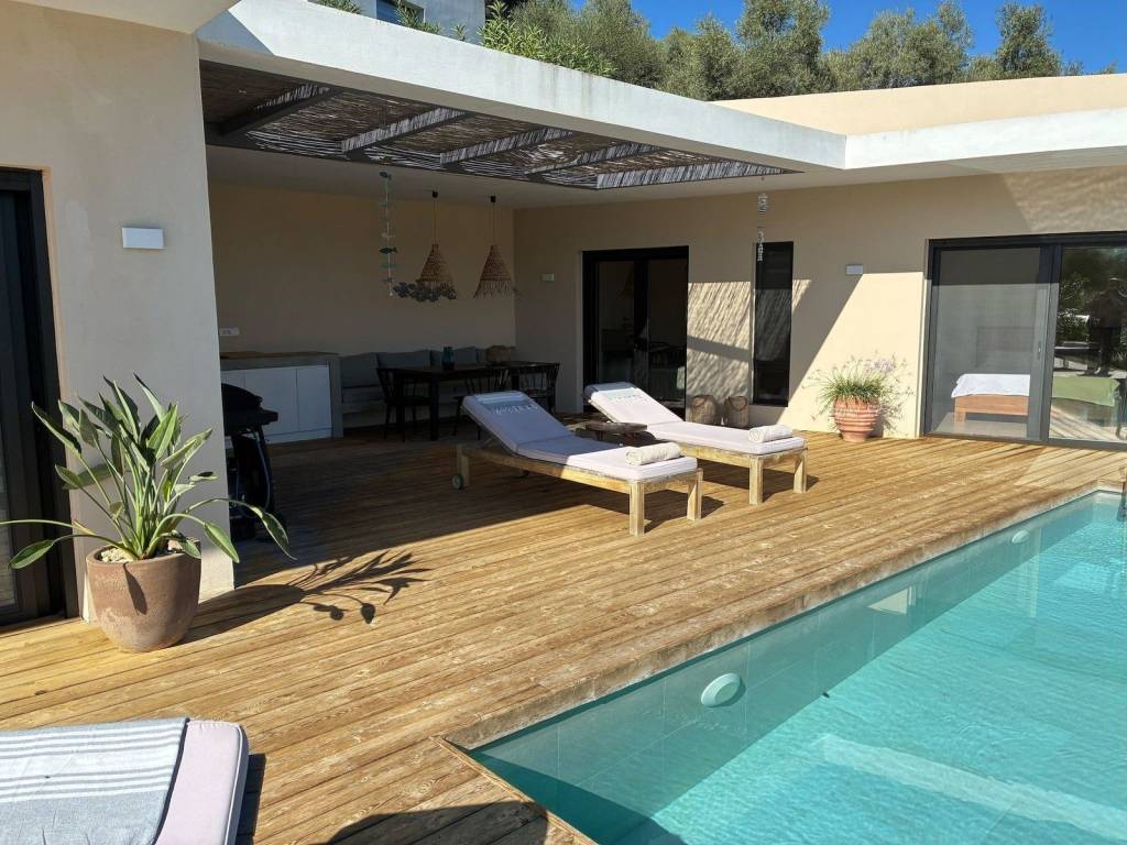 Throughout the property, floor-to-ceiling sliding glass doors flood the interiors with natural light and frame pleasant open views, while double-glazed windows ensure year-round comfort. The villa's outdoor area is dominated by an infinity pool and a 100 sqm sundeck. These are completed by the terrace connecting the two wings of the villa and featuring a fully fitted outdoor kitchen, equipped with a countertop, hot and cold water, a gas barbecue, and a large dining table for six, making it ideal for alfresco dining and relaxed summer evenings in one of Greeceâs most appealing coastal settings. Parking is available on the premises, while access is via a paved road.