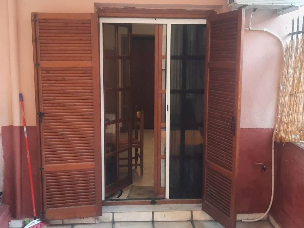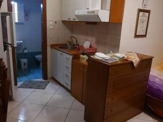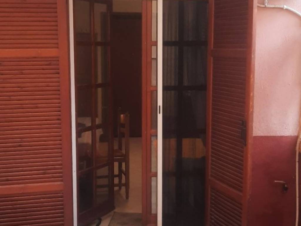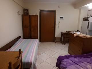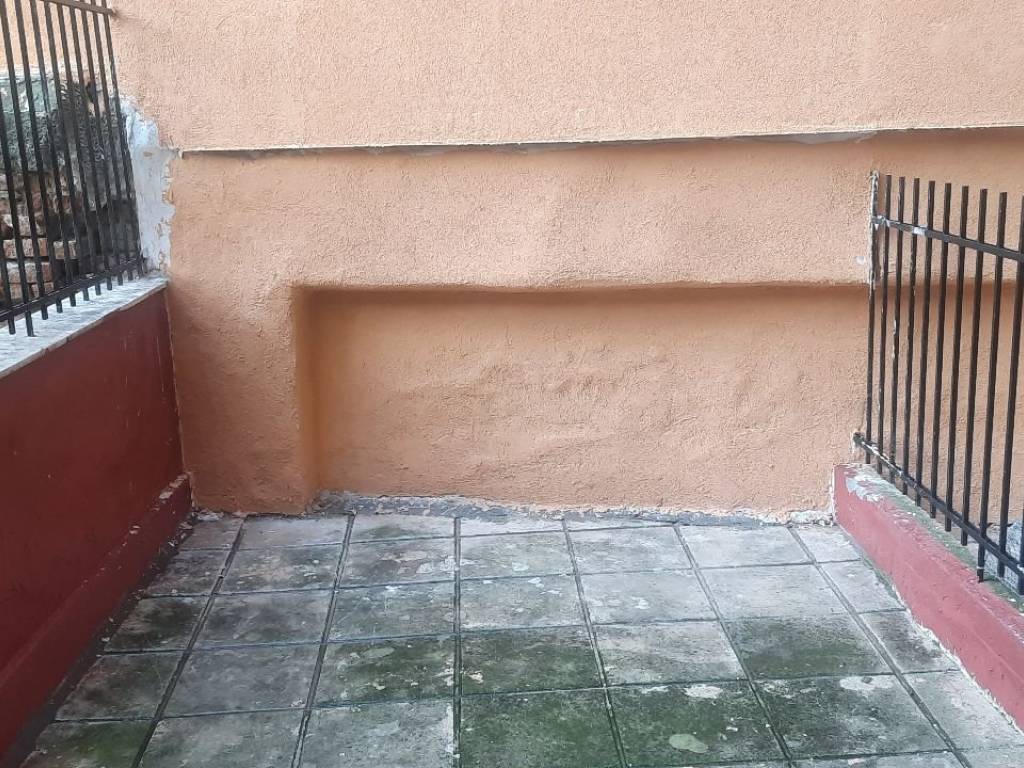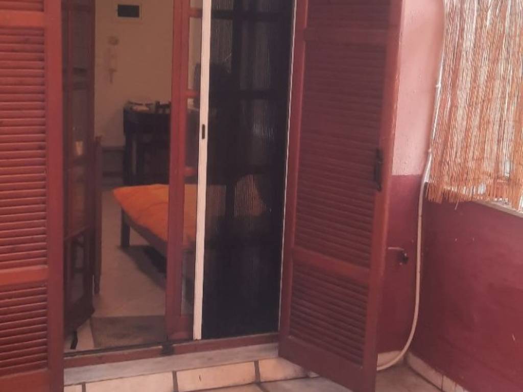 Furnished semi-basement studio apartment for rent, featuring a private ground-level courtyard. The property includes two beds, a wardrobe, a chest of drawers, a desk, a table, and three chairs. It is equipped with a refrigerator and a cooking hob, and is ready for immediate occupancy.