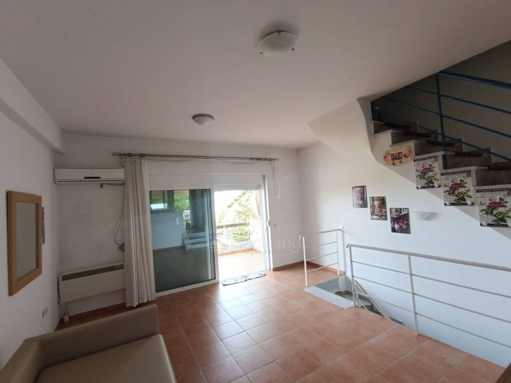 The internal staircase leads to the upper floor where there are two bedrooms. Each has a separate balcony, offering privacy but also allowing the resident to enjoy the view from different angles. The bedrooms are quite bright thanks to the general orientation of the view and the openings to the balconies. On the same floor, there is a full bathroom, adequate in size for everyday use, with space for a shower or bathtub, sink, and toilet.