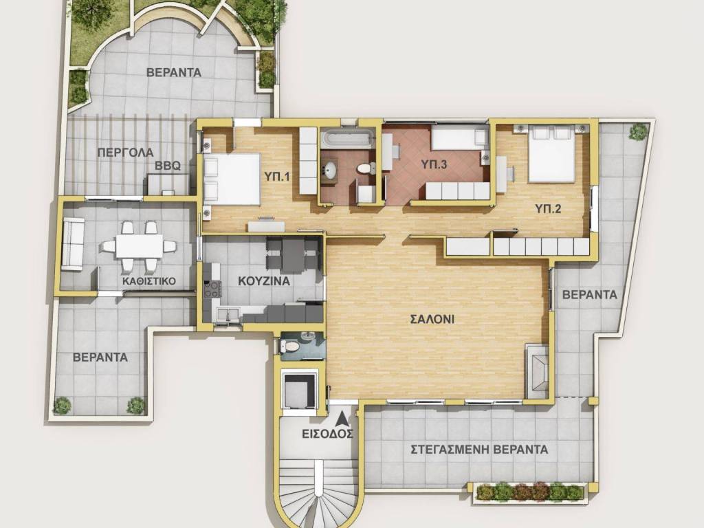 Exceptional 140 sq.m. first floor apartment in a quiet neighborhood in the center of Kifissia. The apartment is bright, airy, and functional. Located in a beautiful building constructed in 2000, which has 3 apartments, this residence has been renovated with high-quality materials and is the ideal home for a family of four. The entrance leads to a comfortable reception area with a fireplace and opens onto a beautiful covered terrace. The modern, functional kitchen is connected to the bright dining room, which is flanked by two terraces, one of which has a built-in barbecue. There are three comfortable bedrooms, one bathroom, and one guest bathroom. This beautiful residence provides warmth with independent natural gas heating, cooling with air conditioning units, and aluminum systems with double glazing. The security of the house is ensured by a security door and an alarm system. The 8 sq.m. storage room and the 12 sq.m. parking space are located in the basement of the apartment building, which is served by an elevator. This modern residence in a very quiet neighborhood of Kifissia is just a 5-minute walk from the center of this most upscale suburb, public transportation, schools, the market, and sports and entertainment venues.