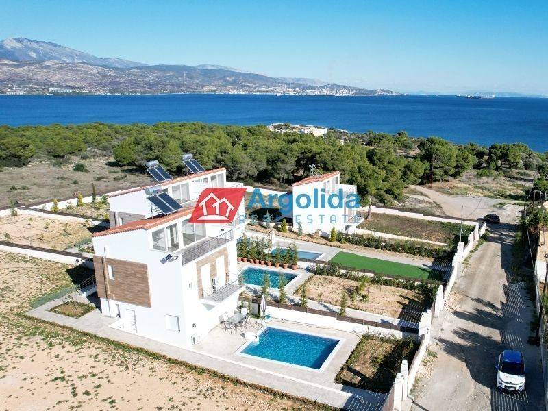 In Kavos, Corinthia, near Isthmia and just 250 meters from the beach, a detached house of excellent construction is for sale, 135 sq.m. in size, on a 1,270 sq.m. plot, featuring a private swimming pool and lush garden. Its unique location, very close to Loutraki, provides easy access to organized beaches, luxury resorts, and wellness facilities, making it ideal for a permanent or holiday home. The layout is highly functional, with the ground floor comprising an open-plan kitchen and living area with 1 WC and direct access to the garden and pool. The mezzanine level includes two bedrooms, one with an en-suite bathroom, plus an additional bathroom for residents’ convenience, while the top floor offers a bright, multi-purpose space with a large terrace and WC, perfect for an extra bedroom or office. The outdoor area is carefully designed with trees, lawn, and parking space for two cars. The combination of high-quality construction, a prime beachfront location, immediate access to the sea, and the amenities of Loutraki makes this property an excellent choice for personal use or investment purposes.