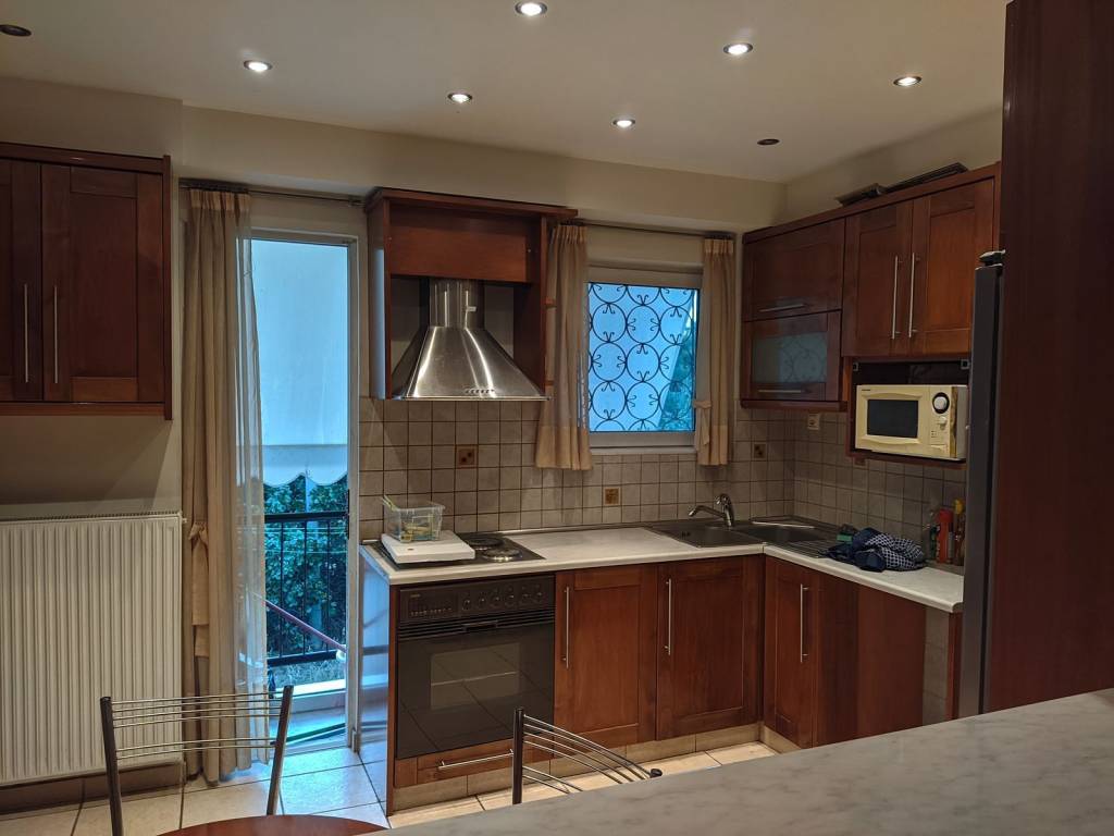 Renovated 3-bedroom corner apartment, bright and dual-aspect. Features 1.5 bathrooms (main bathroom + guest WC), a security door, and a pre-installed alarm system. Equipped with built-in wardrobes, double-glazed windows, elevator, and retractable awnings. Includes autonomous natural gas heating, a fireplace, and a designated covered parking space. Situated in a quiet residential neighborhood, within walking distance of public transport and Deree - ACG. No pets allowed.