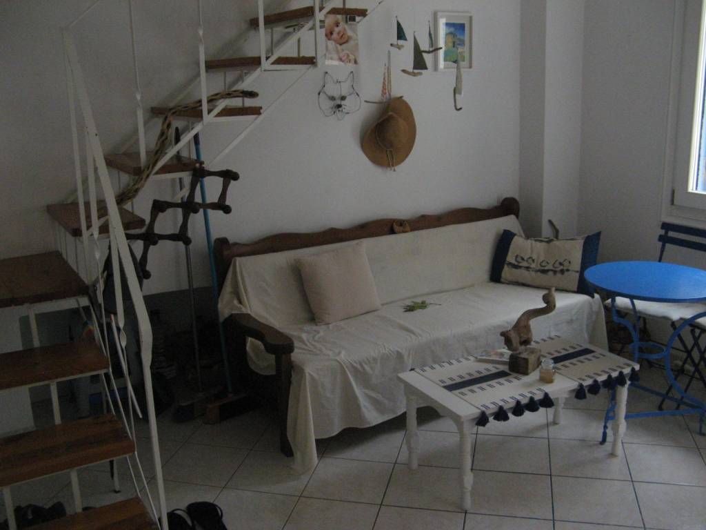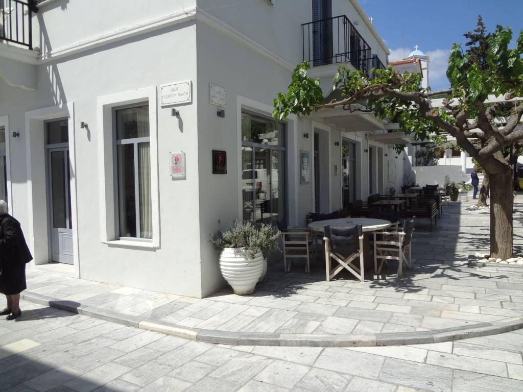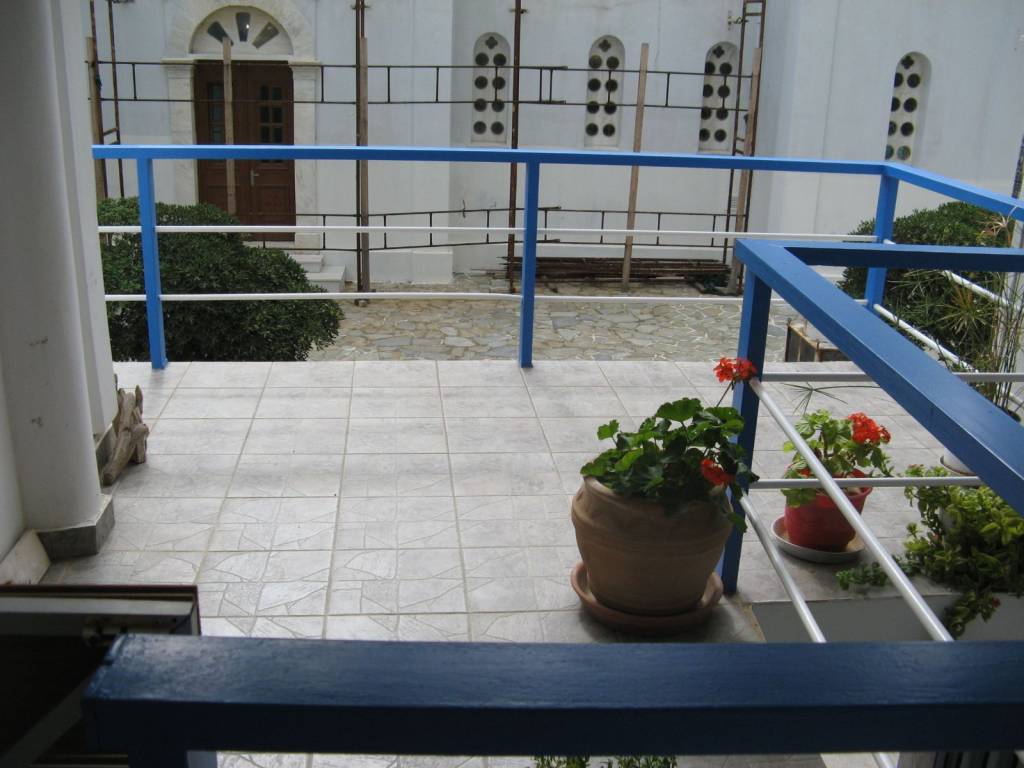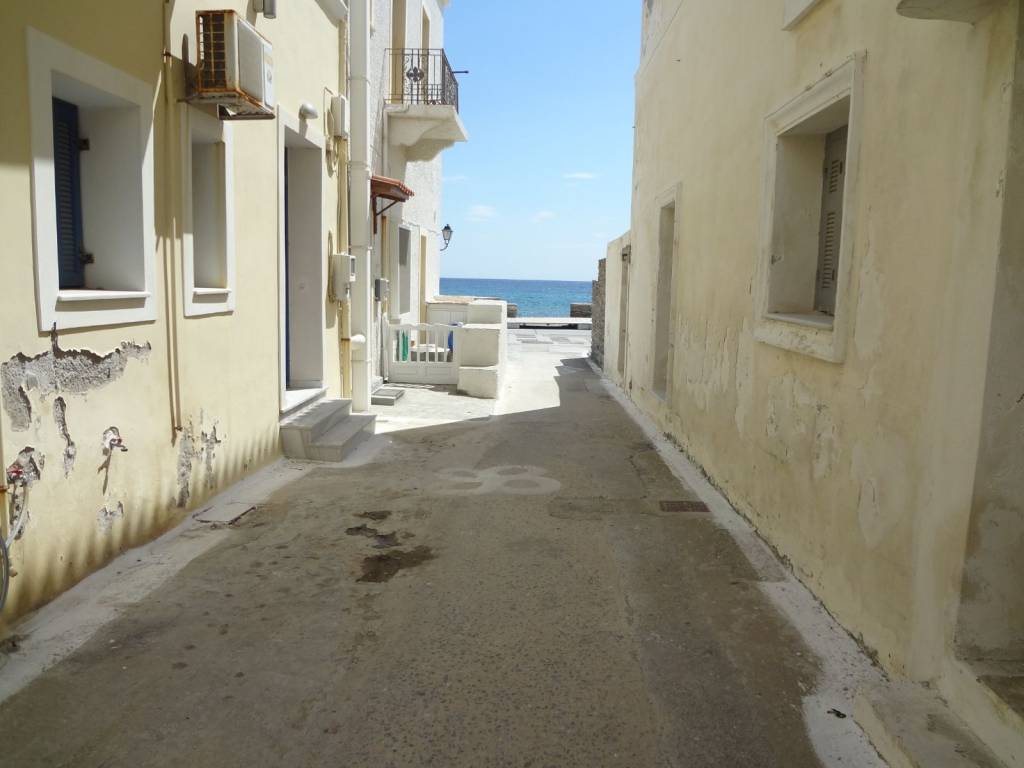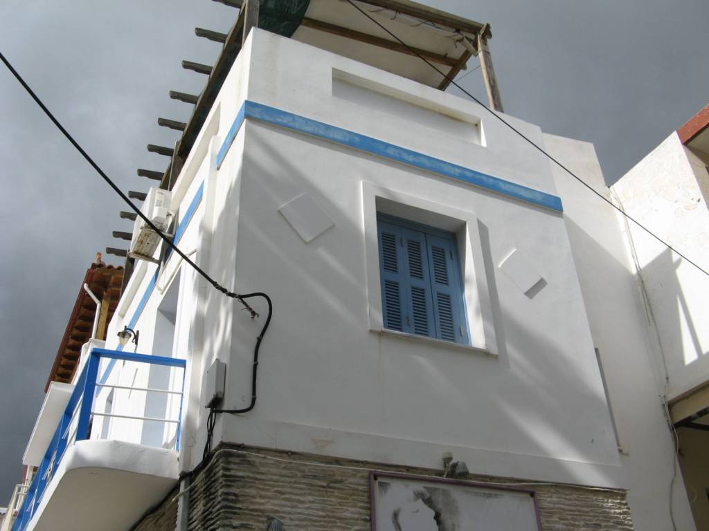Andros island is 2 hours away by ferry from Rafina. Disembarking from the ferry we take the road to the island's capital, Chora, after about 30km we will meet a sign on our right Ormos Korthiou we follow the road on the right which after about 15km will take us to the sea where the village is. In the center of the village is the church of Agios Nikolaos and on the left side as we look at the church on the corner of the road is the property. Which is three-storey, on the ground floor there is a shop which is currently rented and operates as a hairdresser, on the side facing the church there is a warehouse and next to it the staircase to the house starts. On the first floor is the main entrance where upon entering to our right is the bathroom, in front of us is a small reception area and opposite to the right is the fully equipped kitchen with a door that leads to a balcony that overlooks the square and the houses, to the left of the entrance is a double bedroom with a wardrobe and bedside tables, the bedroom has a window that overlooks the staircase and the church. At the entrance to the bedroom begins the internal staircase that leads us to the upper floor, as soon as we go up to the left there is a space with a single bed and a window that overlooks the terrace and at the end of the stairs a small living room with the entrance to the second double bedroom with a wardrobe and a window. From the small living room is the door that leads us to a terrace with a spectacular view of the village all the way to the sea. Next to the property is the market with many shops, cafes, 2 pharmacies, a Health Center, and below is the coastal road that leads us to four beaches for swimming.