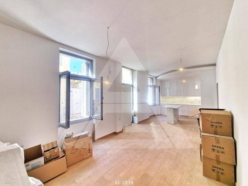 Piraeus, Kastella - Floor Apartment 98sqm plot 100sqm, bedrooms 2, master bedrooms 2, levels 1, ground floor (98sqm), renovated, year built 1940, renovation year 2023, energy class D, living room, kitchen, 3 bathrooms, heating type: individual unit (natural gas), quiet, dual aspect apartment, luminous, frontage, painted, drop ceiling, boiler, aluminum frames, double glazed windows, door screen, wood floors, without common charges, secure door, pets allowed, residential zone, access from asphalt.