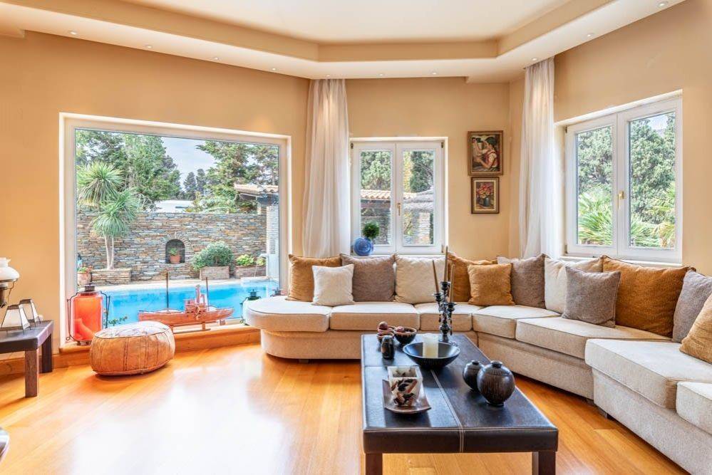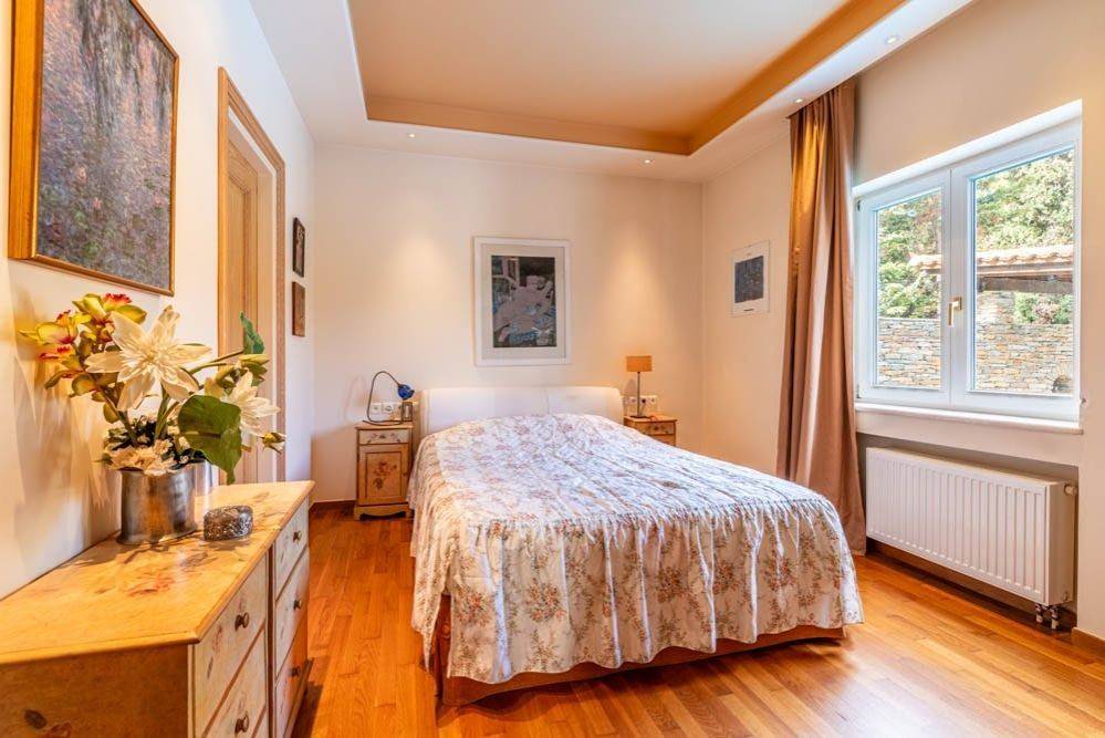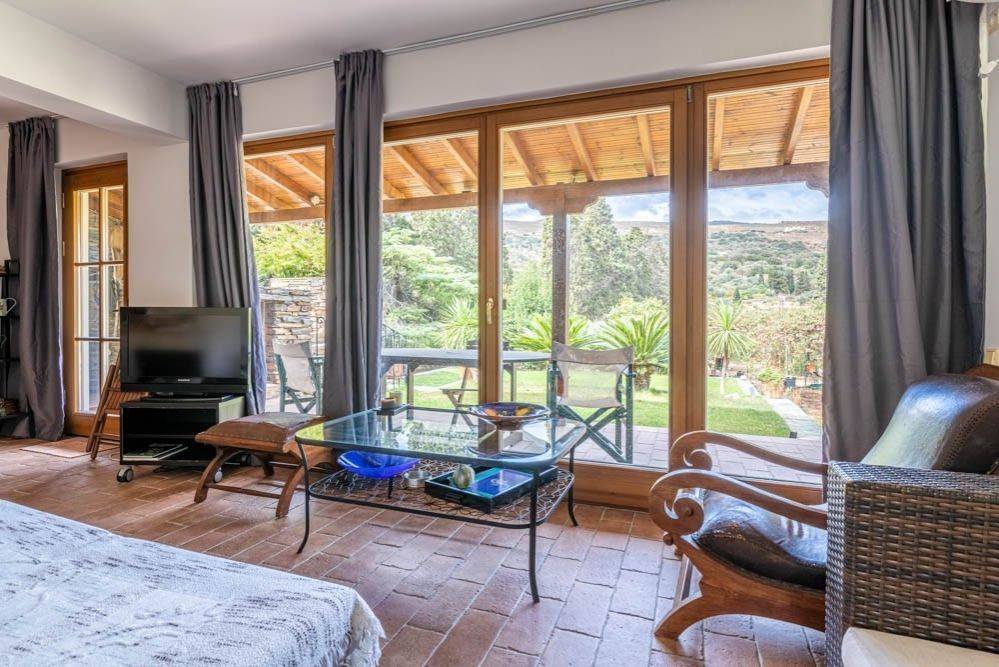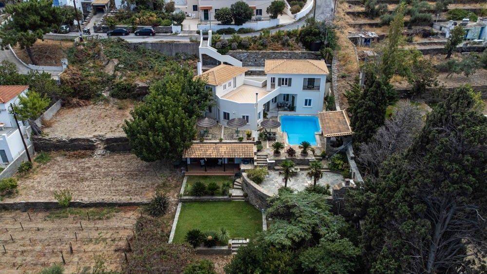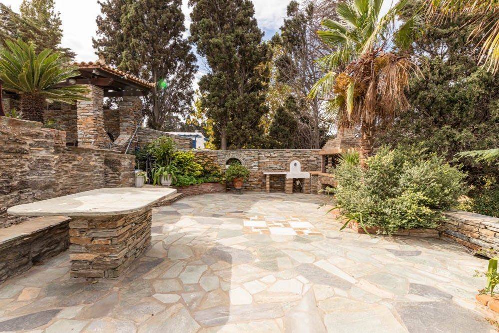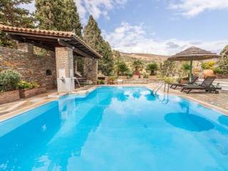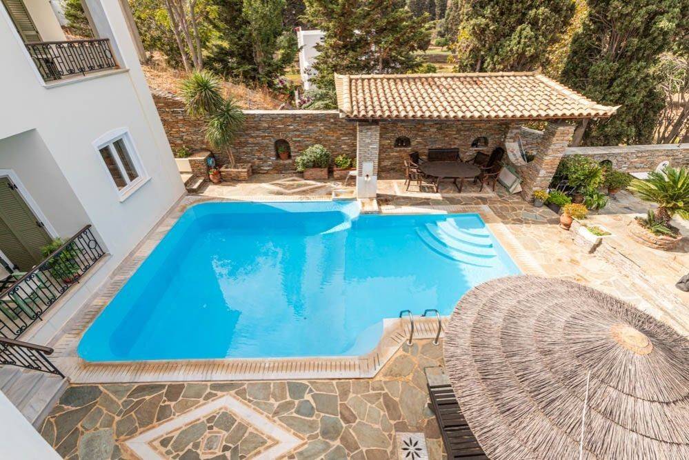 Set on a 4,852 sq.m. plot, this modern villa offers comfort, privacy and refined aesthetics in a peaceful, pastoral environment — while being just minutes away from all amenities and the beaches of Chora. The main residence features 3 bedrooms, 3 bathrooms, a spacious kitchen with an additional prep area, and a private office located on an upper level. Warm details such as wooden floors and staircases enhance the interior’s elegant character. The outdoor areas include balconies and verandas with hand-finished marble elements, as well as stone-paved surfaces surrounding the pool and central courtyard, creating ideal spaces for relaxation and outdoor living. On the lower level, there is an independent guest house consisting of a large open-plan room with kitchen and living area, a bathroom and a storage room — perfect for hosting guests or using as a private suite. Additionally, there is a separate storage room and a wine cellar featuring an old well. The beautifully landscaped garden with ornamental plants, lawn and tall cypress trees provides an excellent natural boundary and complete privacy. Beside the pool’s courtyard, a fully equipped BBQ area offers a wonderful setting for gatherings and leisure time. The view extends over the fertile valley with olive trees, fruit trees and vineyards, adding to the property’s serene charm. The plot also offers secondary vehicle access through the valley, as well as a second well with abundant water. There is further potential for expansion: the property borders a 600 sq.m. plot, within village boundaries, available for sale, allowing construction of up to 400 sq.m. for residential use (more for commercial purposes). This option provides valuable flexibility for future development. A true oasis near Andros Town — ideal for those seeking privacy, comfort and a high-quality residence in one of the island’s most desirable locations. Location: Andros is the northernmost island of the Cyclades, in the Aegean Sea, and the second largest, after Naxos. Unique Features: Andros is a miniature look alike of Greece. The traditional Cycladic landscape, and architecture is combined with high mountains, rivers, valleys, fresh running water springs, and numerous stunning beaches, under a bright sun. Its famous and amazing network of 200 km of paths, known as Andros Routes certified by the EU, attracts excursionists from all over the world to discover the hidden beauties of the island. The capital of the island, Chora, is one of the most beautiful in the Cyclades. It features museums, such as the Archaeological Museum, and the Museum of Contemporary Art, with new exhibitions each summer. The unique, one and a half mile pedestrian walk, in the middle of the town guides you to the traditional Cycladic architecture, and history, with numerous restaurants, cafés, and shops alongside. Enjoy fresh fish restaurants, by the sea in the village of Korthi, and the cosmopolitan, picturesque, seaside village of Batsi. Accessibility: Andros is accessible from the port of Rafina and is the closest island of the Cyclades from Athens. There are at least four daily ferry services during the summer season and at least two during the winter. The journey takes just two hours. It is also connected by ferry to Tinos and Mykonos. Investment Opportunity: The cosmopolitan character of the island and its stately beauty make it a magical tourist destination strongly increasing investment interest