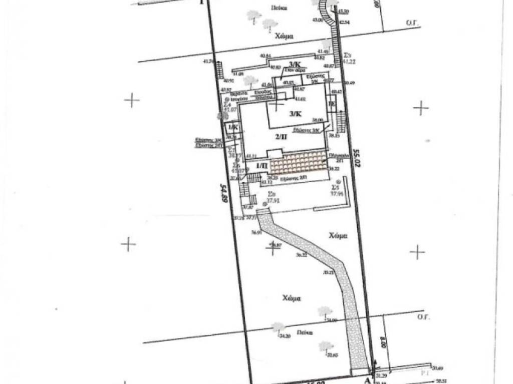 Οικόπεδο προσόψεως, διαμπερές 941,86τ.μ., σ.δ.0,4, πρόσοψη 16,90μ, πρόσοψη 17,38μ, βάθος 54,89μ, βάθος 55,02μ, θέα απεριόριστη, επικλινές, εντός σχεδίου, υπάρχει τριώροφο κτίσμα