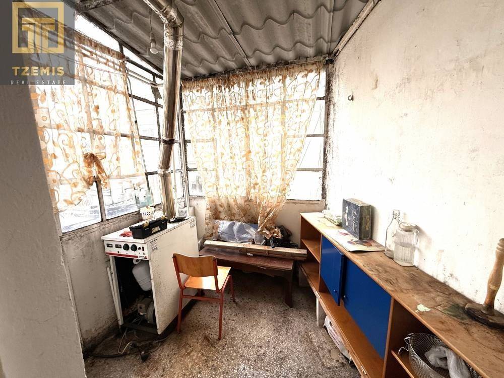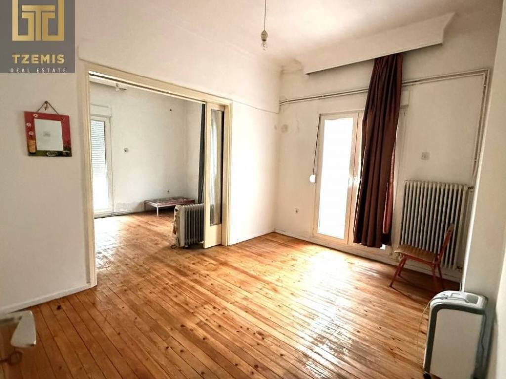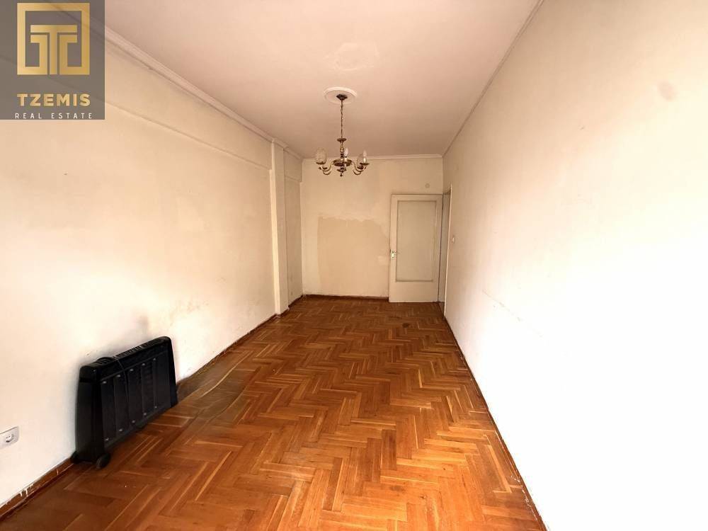 The apartment consists of 3 bedrooms, a living room, a kitchen (with additional extension), and a bathroom. Additionally, it features an elevator, central oil heating & air conditioning, a security door mosaic & wooden flooring and a wrap-around balcony. In need of renovation!