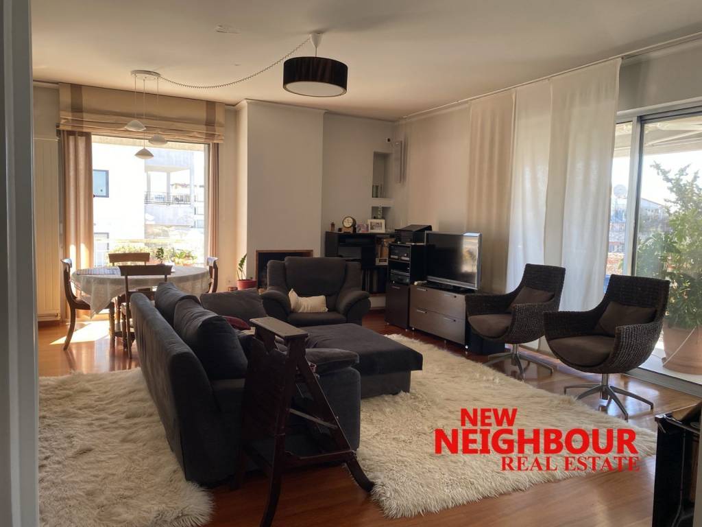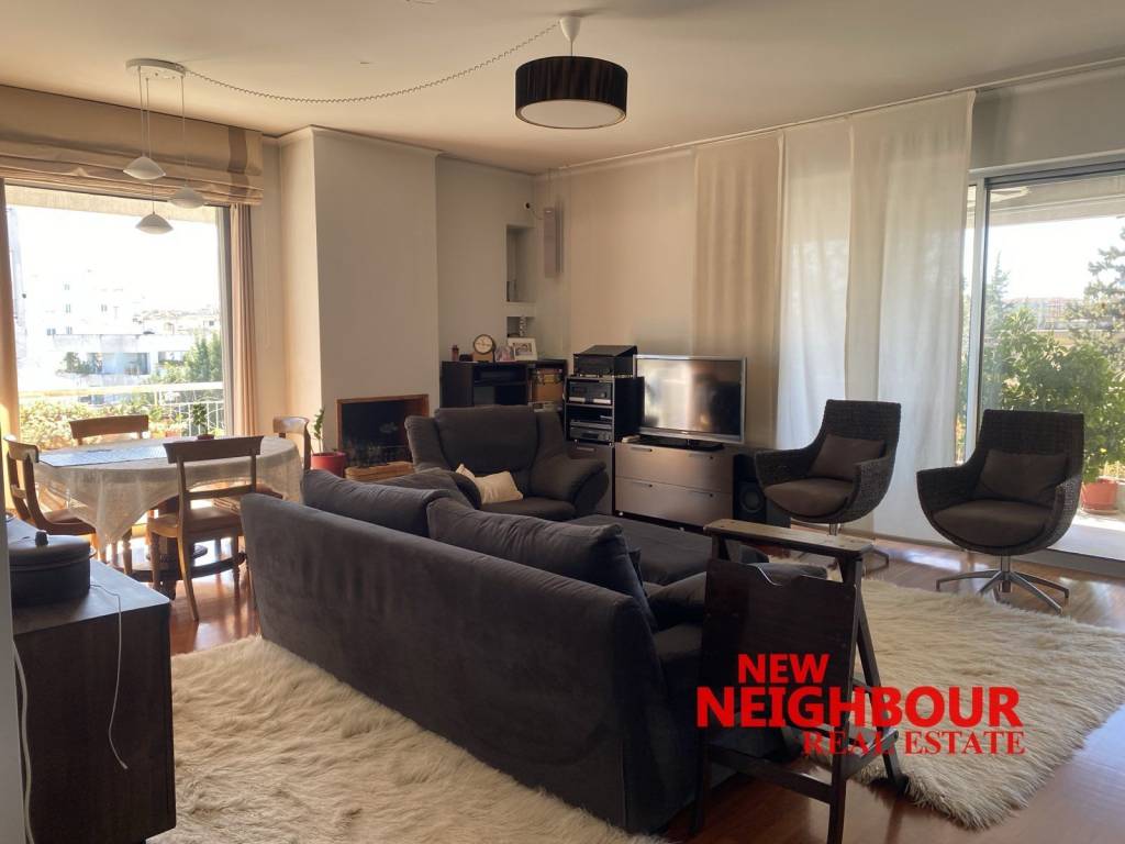 Apartment of 122 sq.m. for sale in Nea Filothei, Amarousi, 4th floor penthouse, built in 1985. It has a spacious living room, separate kitchen, 2 bedrooms, bathroom and guest WC, as well as another room which can be used either as a 3rd bedroom or as an office. It has autonomous natural gas heating, fireplace, solar water heater, security door, aluminum frames with double glazing (not renovated), many wardrobes and a parking space in the basement. The bathrooms and the kitchen as well as the floors are renovated with great taste. It is a house in really impeccable condition, very beautiful, with a south - east orientation and plenty of sun. From our balcony we have a nice horizon towards Hymettus. A truly very beautiful house!!!! Price 390,000 euros. NEW NEIGHBOUR REAL ESTATE AGENCY, contact phone: 2167005657, email: info@newneighbour.gr, website: www.newneighbour.gr