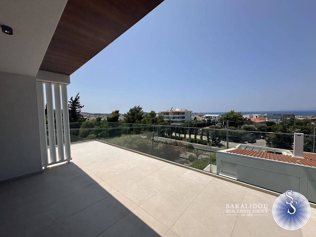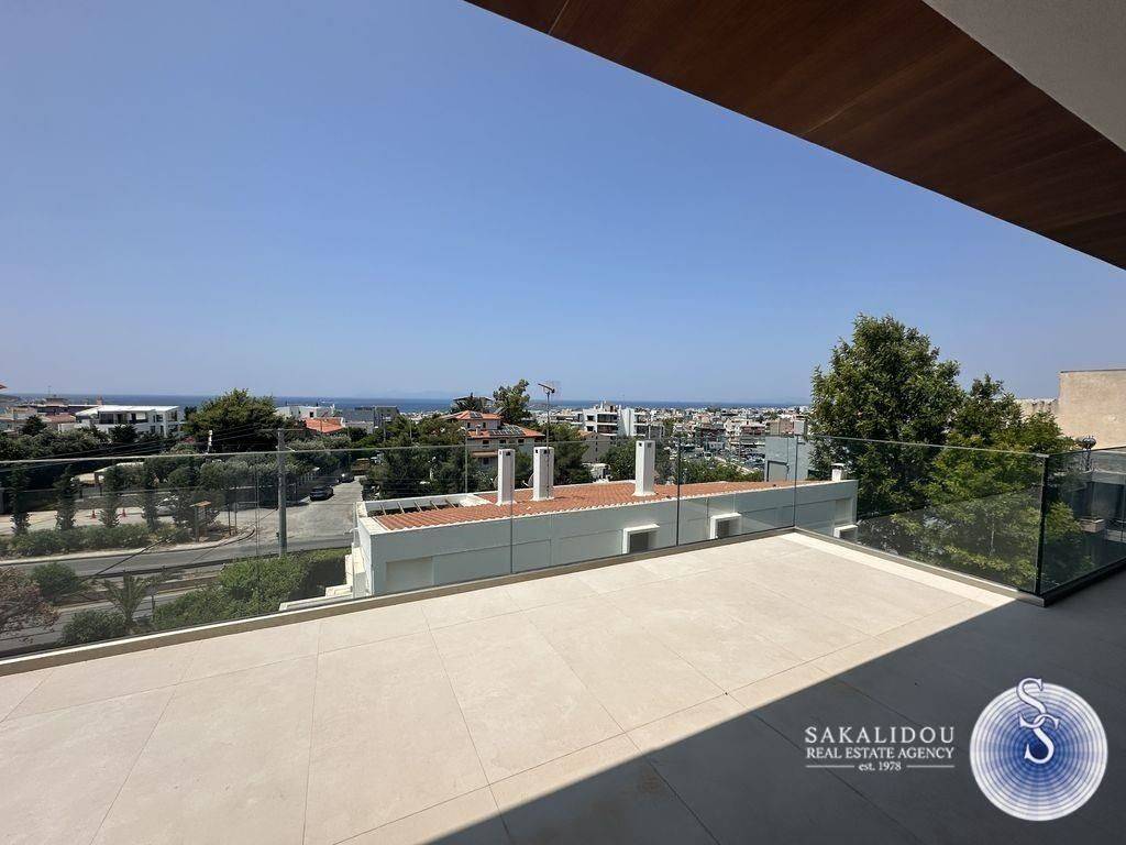 Voula – Newly Built Penthouse Maisonette, 3rd–4th Floor, 202 sq.m., featuring minimal design and beautiful sea views. It consists of a spacious reception area with a modern, fully equipped kitchen, 3 ensuite bedrooms, and terraces with stunning sea views. The property features wooden floors, mosquito screens, central cooling and heating system, underfloor heating, a storage room, and 2 underground parking spaces. Located in a lovely area next to a park, in a central location, close to public transportation.