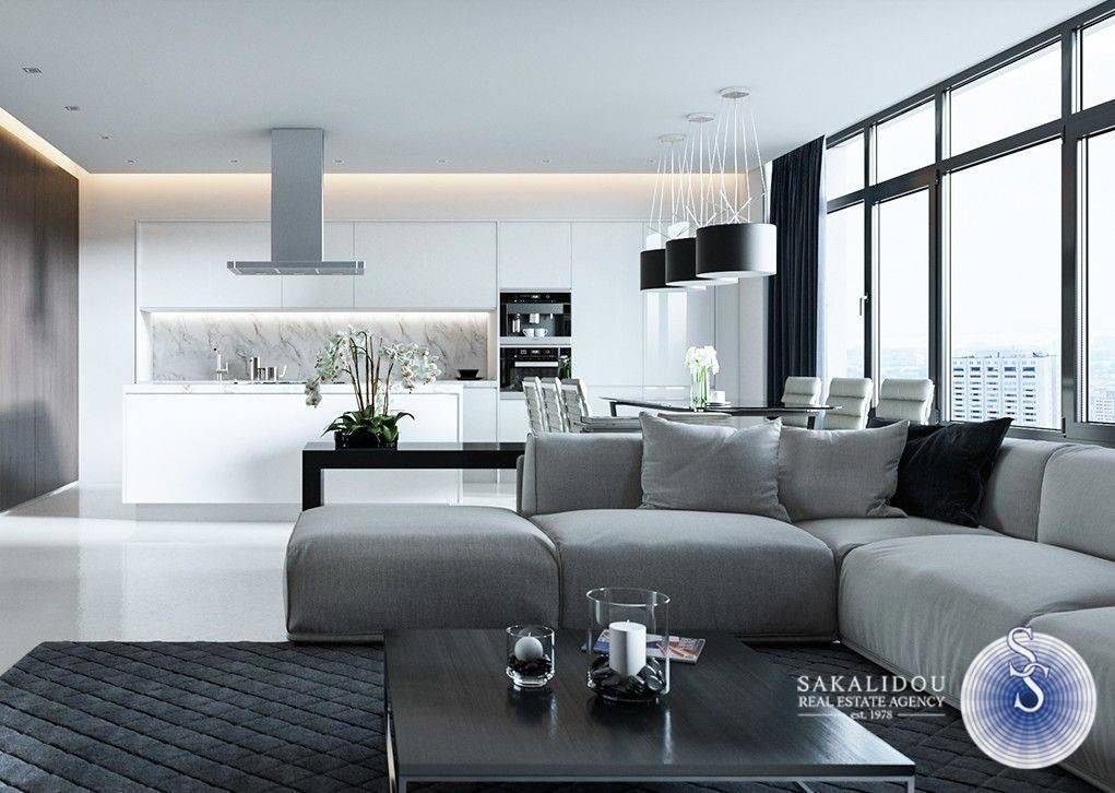 Voula, Kato, luxurious modern penthouse maisonette, 4th - 5th floor, 320 sq.m., with fantastic sea view. It features 4 bedrooms, two of which are master suites, 1 bathroom, 1 WC, a large living room with fireplace, 2 fully equipped kitchens, laundry room, autonomous natural gas heating, wooden floors, electric shutters, electric awnings, 3 underground parking spaces, and storage room. Available June 2025.