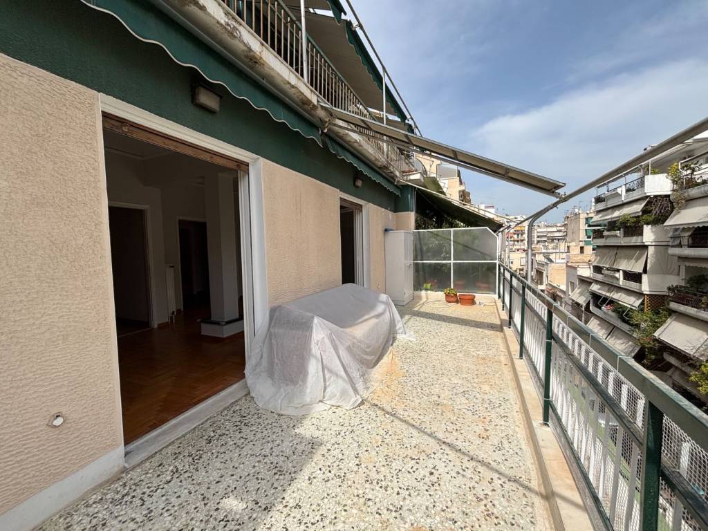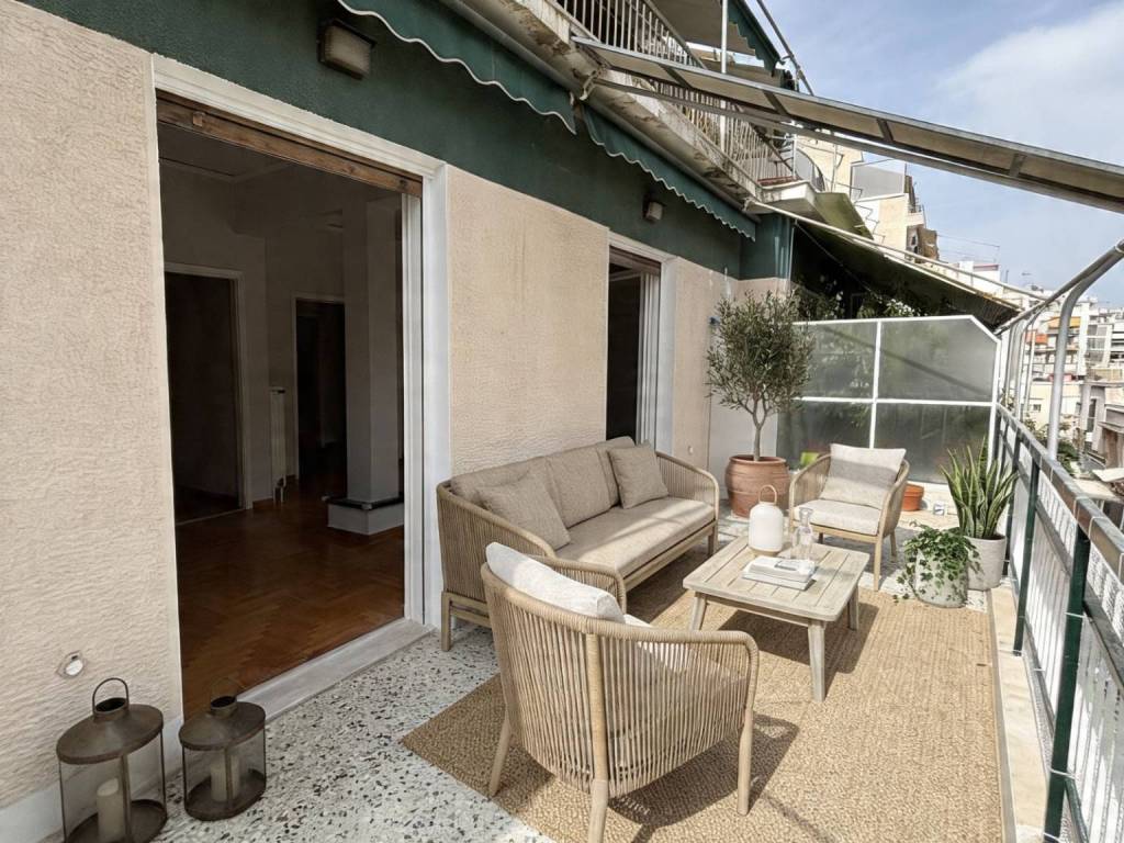 Sunny penthouse in a quiet neighborhood with immediate and easy access to all central locations. The apartment is spacious and dual-aspect, with ample storage space in every room, including loft storage areas and an internal storage room. It features three rooms, ideally arranged as two bedrooms and one office. It has double-glazed windows for insulation and wooden floors. The property has been freshly painted, and the floors have just been maintained, polished, and refreshed. It also features a brand-new security door. The bedrooms are equipped with air conditioning. The balcony is exceptionally large (30sqm), with open sky views. The apartment is truly filled with natural light (the photos and video were taken without electricity or artificial lighting). The property is offered with no agent’s fee. Location: Close to Syngrou Avenue, providing direct access to public transport and main exits toward Piraeus and Faliro. 800 m from the Stavros Niarchos Foundation Cultural Center. Two supermarkets just one street away. 10–15 minutes on foot to the central markets of Kallithea and Nea Smyrni. Harokopio University and Panteion University nearby. Ten minutes by car from Philopappou Hill and the Acropolis.