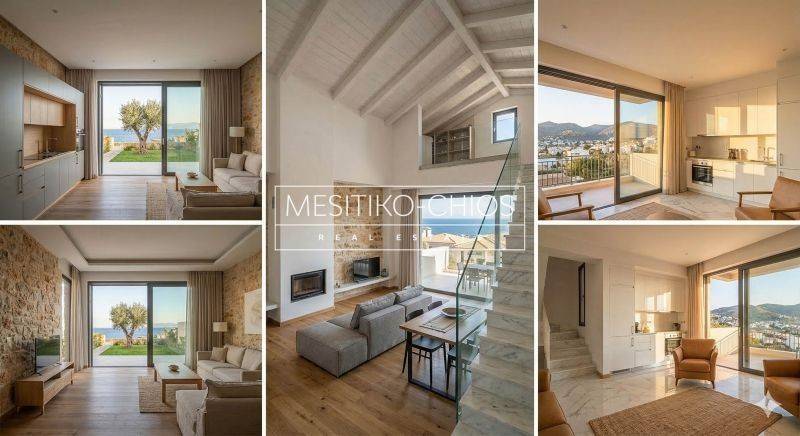 - Chios Omiroupoli Paraliaki Vrontadou FOR SALE ground floor apartment with a total area of ​​118.52 sq m. on a plot of 476 sq m. only 10 meters from the sea. It consists of 2 bedrooms, living room, kitchen, 2 bathrooms and WC. Construction began in 2026 with energy class A+ and features underfloor heating - heat pump, unlimited views, aluminum frames, wooden floors, security door with trident, built-in wardrobes, elevator, parking, storage room, garden, A/C, screens, double glazing, solar water heater, BBQ, video door entry, opening distance from city 5000 meters distance from airport 8500 meters - Price: €530,000