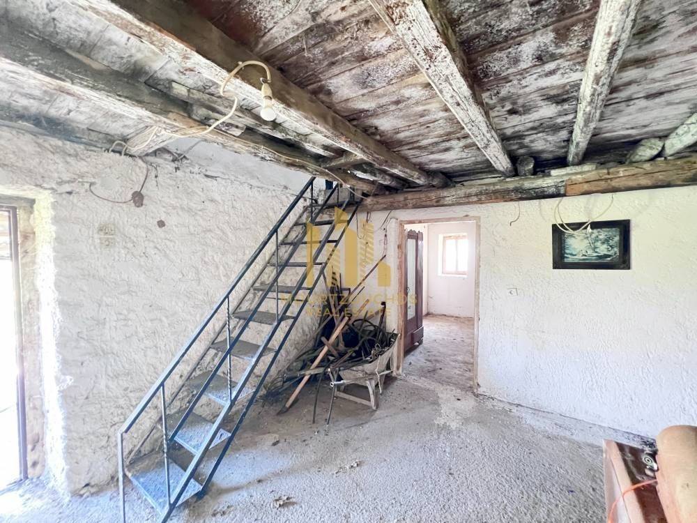 The house was built in 1950 and is developed over two levels with a total area of 110 sq.m. The ground floor (55 sq.m.) includes a kitchen, one bedroom and an external bathroom, while the upper floor (55 sq.m.) is an open-plan space with a fireplace, offering flexibility for customization according to the needs of the new owner.