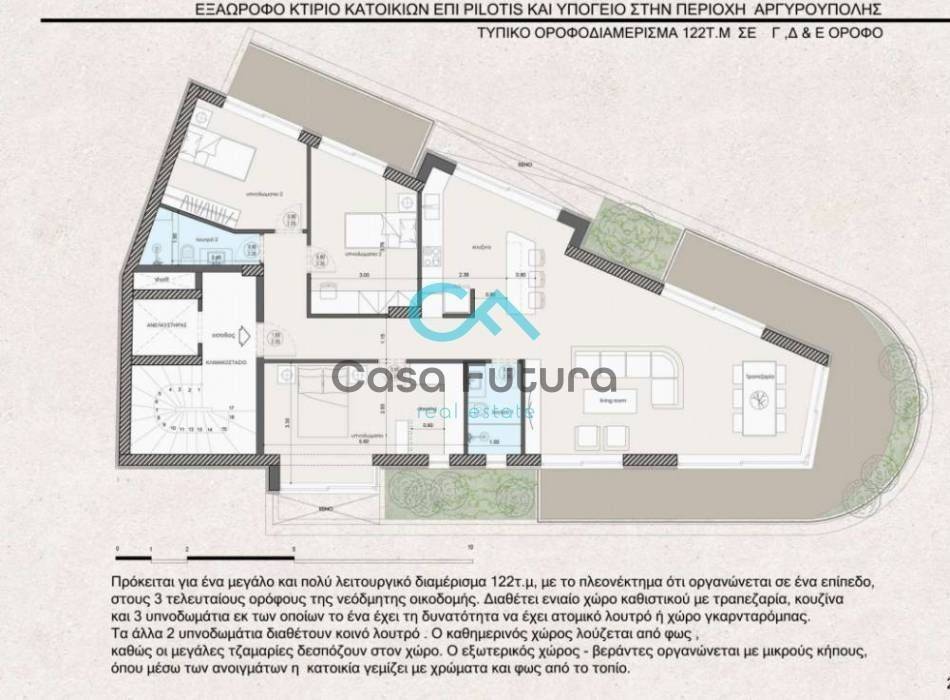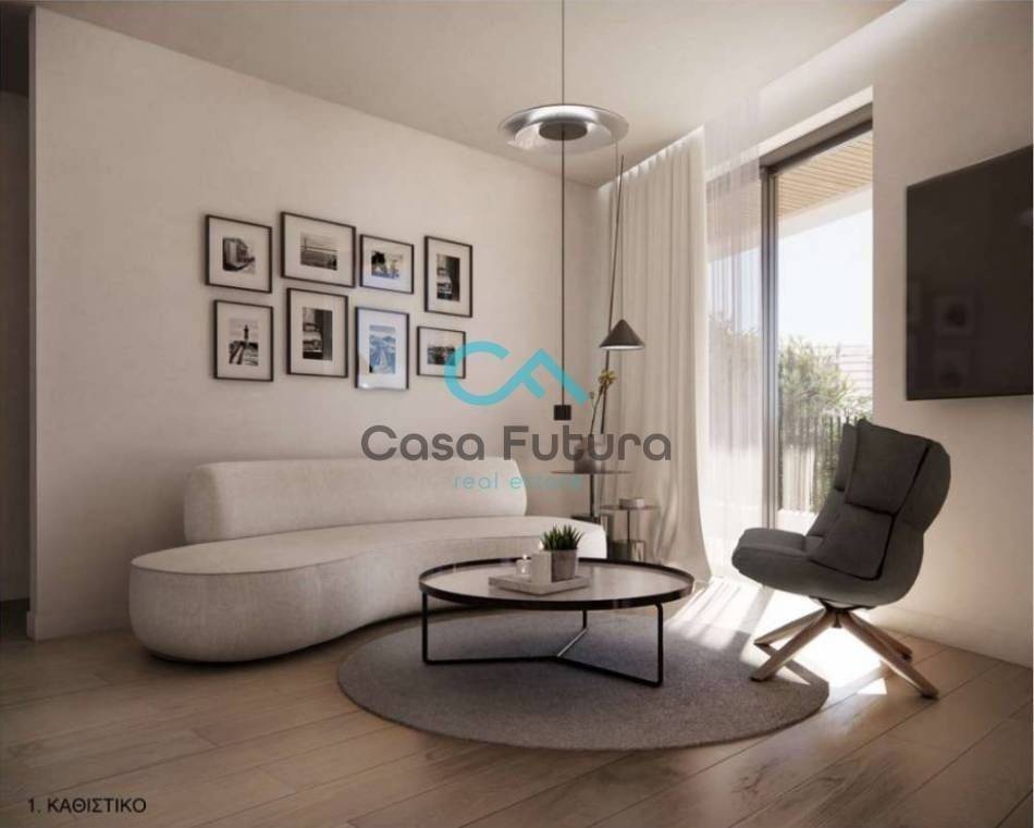 It is a spacious and fully functional apartment of 122 sq.m., which is developed on one level, occupying the top three floors of the building, offering a unique sense of privacy and comfort. The living space consists of a single, bright living and dining environment, which blends harmoniously with the modern kitchen, creating an ideal core of everyday life. The large windows that dominate the space allow natural light to diffuse freely, highlighting the sense of spaciousness and the modern architecture. The property has three comfortable bedrooms, including: • The master bedroom offers the possibility of configuration in a walk-in bathroom or dressing room • The remaining two bedrooms are served by a shared, functional bathroom The outdoor space is developed in spacious terraces, which are organized in small private gardens, offering ideal conditions for relaxation and hospitality. Additional Features: • Individual heating with a heat pump • Fan coil system for cooling - heating • Parking • Warehouse • Modern construction of high standards • Estimated delivery: March 2028 Price €270,000 | Property Code: #63-9726
