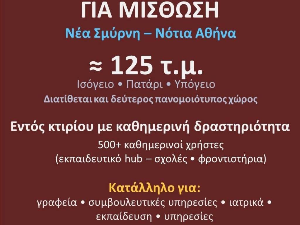 ΕΠΑΓΓΕΛΜΑΤΙΚΟΣ ΧΩΡΟΣ ΠΡΟΣ ΜΙΣΘΩΣΗ – ΝΕΑ ΣΜΥΡΝΗ Στη Νέα Σμύρνη, σε ιδιαίτερα λειτουργική τοποθεσία με εύκολη πρόσβαση σε συγκοινωνίες και καθημερινές εξυπηρετήσεις, διατίθενται προς μίσθωση δύο ισόγειοι επαγγελματικοί χώροι, οι οποίοι μπορούν να μισθωθούν είτε ξεχωριστά είτε ενιαία. Οι χώροι βρίσκονται σε κτίριο που λειτουργεί ως εκπαιδευτικό hub με περισσότερους από 500 μαθητές, δημιουργώντας σταθερή καθημερινή παρουσία και δραστηριότητα. Η περιοχή είναι πυκνοκατοικημένη, με έντονη καθημερινή κίνηση και άμεση πρόσβαση σε τραμ και λεωφορεία. Βασικά Χαρακτηριστικά • Επιφάνεια 125 τ.μ. ανά χώρο • Ισόγειο με πατάρι και υπόγειο • Δυνατότητα συνένωσης σε ενιαίο χώρο περίπου 250 τ.μ. • Πρόσοψη σε δρόμο γειτονιάς • Εύκολη πρόσβαση σε μέσα μεταφοράς Σημαντικό Πλεονέκτημα Η εγκατάσταση εντός κτιρίου με εκπαιδευτικές δραστηριότητες δημιουργεί σταθερή καθημερινή ροή ανθρώπων (μαθητές, γονείς, επισκέπτες), κάτι που μπορεί να λειτουργήσει υποστηρικτικά για επαγγελματικές χρήσεις που σχετίζονται με υπηρεσίες. Στην ευρύτερη περιοχή λειτουργούν σχολές, φροντιστήρια και εκπαιδευτικά κέντρα, ενισχύοντας τη ζωντάνια της τοποθεσίας. Κατάλληλο για • Γραφεία εταιρειών • Εκπαιδευτικές δραστηριότητες • Ιατρικά / παραϊατρικά κέντρα • Συμβουλευτικές υπηρεσίες • Coworking space • Back-office λειτουργίες Μίσθωμα €1.250 / μήνα ανά χώρο