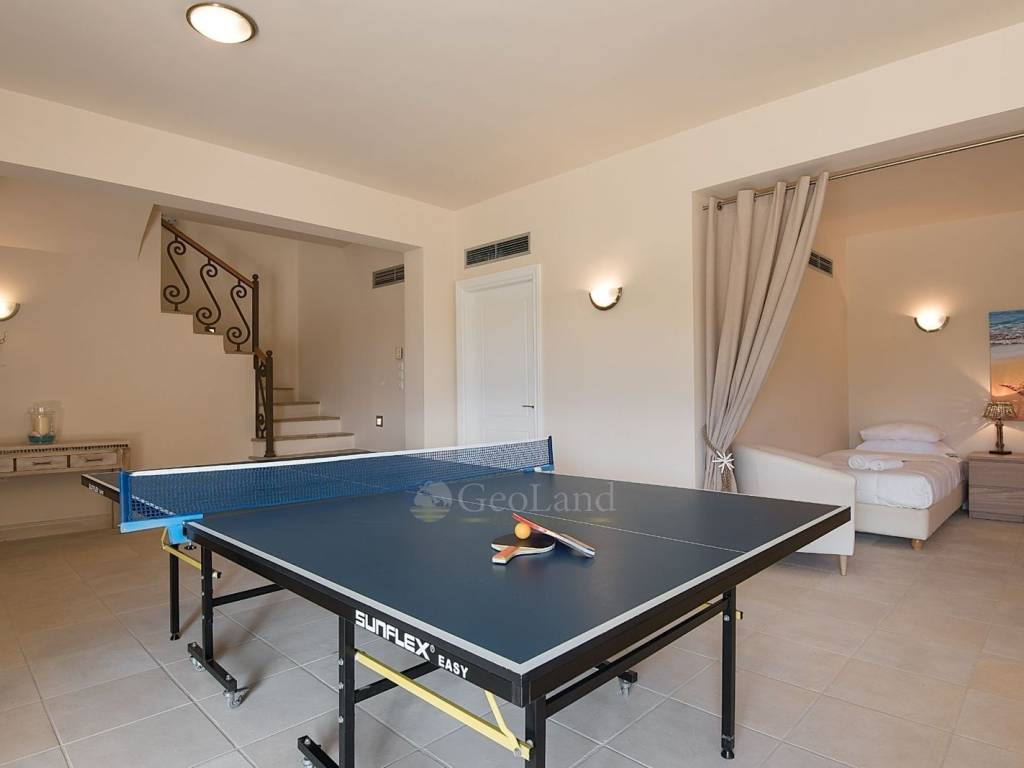 The main area of the villa includes an open-plan living room with a fireplace, where large glass doors offer unobstructed sea views. The kitchen, fully equipped with modern appliances, is ergonomic and connects harmoniously with the dining room, creating an ideal space for family gatherings and dinners.