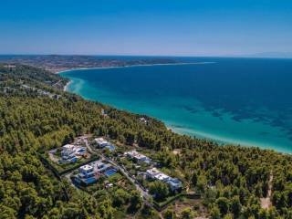 Siviri, Kassandra Peninsula, Halkidiki is a picturesque traditional village on the west coast, where Byzantine heritage harmoniously blends with modern comforts. Golden sandy beaches, authentic waterfront tavernas, cozy cafes, and a relaxed pace of life far from the bustle of tourists. The villa is nestled among a dense pine forest on an elevated position, offering breathtaking panoramic sea views. A small bay with clear waters is an easy stroll away, ideal for swimming and relaxing by the shore. Thessaloniki International Airport is 83 km away (approximately 1 hour's drive).