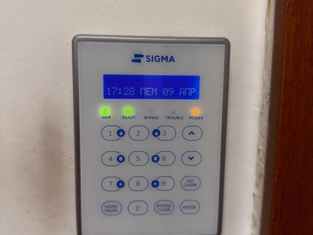 The apartment consists of 3 bedrooms, a living room–dining area with kitchen, a bathroom, a WC, and a storage room. Additional features include an elevator, ceiling fans, synthetic window frames with double glazing, a security door, tile and wood flooring, a video door entry system, and an alarm system.