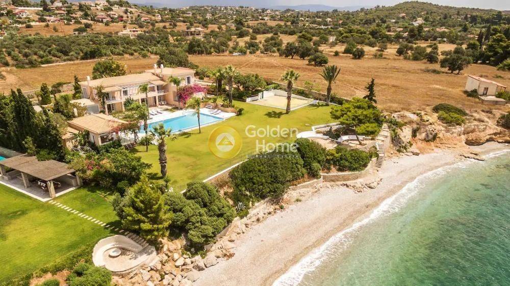 This elegant beachfront Villa is located in Porto Heli area and offers tranquility and privacy for all the guests. The villa consists of 2 open-concept houses with totally 6 bedrooms, 2 living rooms, 2 dining rooms and 2 fully equipped kitchens. Both the living and dining rooms open onto the covered terrace and offer sea views. A single-family house is semi-detached to the villa including 2 bedrooms ,2 bathrooms, a fully equipped kitchen, a living room, and a dining room. Regarding the exterior of this amazing villa, there are wonderfully landscaped gardens with lawns, olive trees, flower-beds and a large swimming pool. It is a unique first-line villa, with direct access to a small beach!!!! For Sale, detached, Full Bathrooms: 4, Half Bathrooms: 3, Living Area: 490 Sqm, Rooms: 12, Year Built: 1998, Holiday Home, Air Conditioning, Swimming Pool, View, Balcony, Furnished, Fireplace, Garden, Internal Stairs, Alarm, Storage Space, Floor Number: Ground Floor, Facade, Pets Allowed, Renovated, Kitchens: 3, Joinery: Aluminium, Floor Type: Ceramic Tiles, Lot Size: 4000 Sqm, Levels: 2, Heating Controller: Autonomous, Heating Medium: Current, Energy Class: C, Orientation: E, Current: Three Phase, Distance Sea: 1
