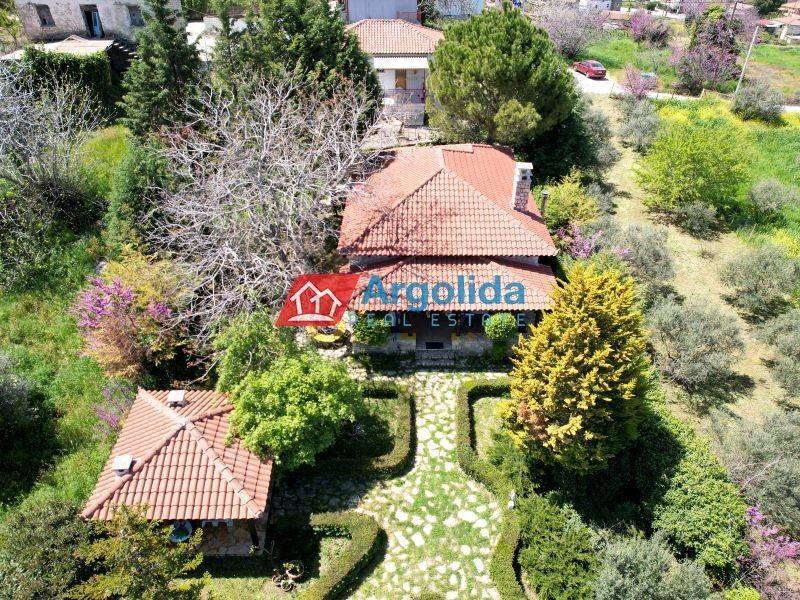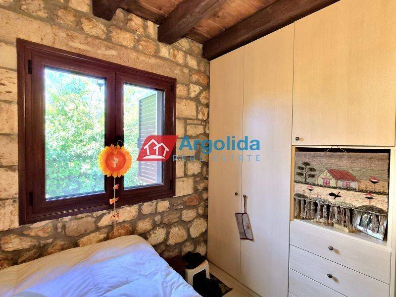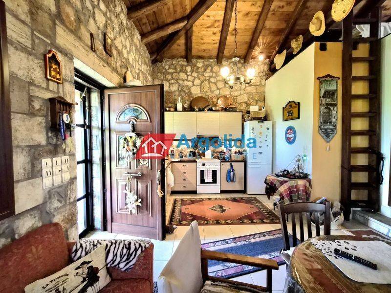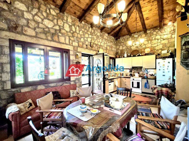 For sale, a stone-built detached house of excellent quality (built in 2008) located in Pyrgos, Corinthia (Evrostini), set on a corner plot of 1,500 sq.m. consisting of four adjoining parcels, offering strong investment potential. The first plot (269 sq.m.) hosts the residence, the second (113.45 sq.m.) provides parking space for 4 vehicles, while the remaining two plots are buildable, ideal for further development or tourist exploitation due to the increasing demand and the prime location near both sea and mountain destinations. The house stands out for its solid construction with 60 cm thick stone walls, combining aesthetics with energy efficiency, and features 3 bedrooms, a loft that can be converted into an additional bedroom, a spacious living room with fireplace, kitchen, and bathroom. It is equipped with aluminum frames with double glazing, insect screens, security door, storage room, CCTV security system, and heating via stove and radiators. The outdoor area is fully landscaped and fenced, featuring an electric sliding gate, BBQ area, and wood-fired oven, surrounded by a beautiful natural setting with olive trees, cherry trees, vineyard, and lawn. The property is bright, airy, dual-aspect, offering panoramic unobstructed views, and is sold fully furnished and equipped, making it ideal for a holiday home, permanent residence, or investment. It is located just 1.5 hours from Athens, only 9 km from the sea (Lygia, Derveni and suburban railway), close to Zacholi and Trikala Corinthias, and just 30 minutes from Lake Doxa and Feneos, perfectly combining mountain and sea lifestyle in a unique natural environment.