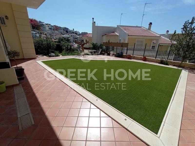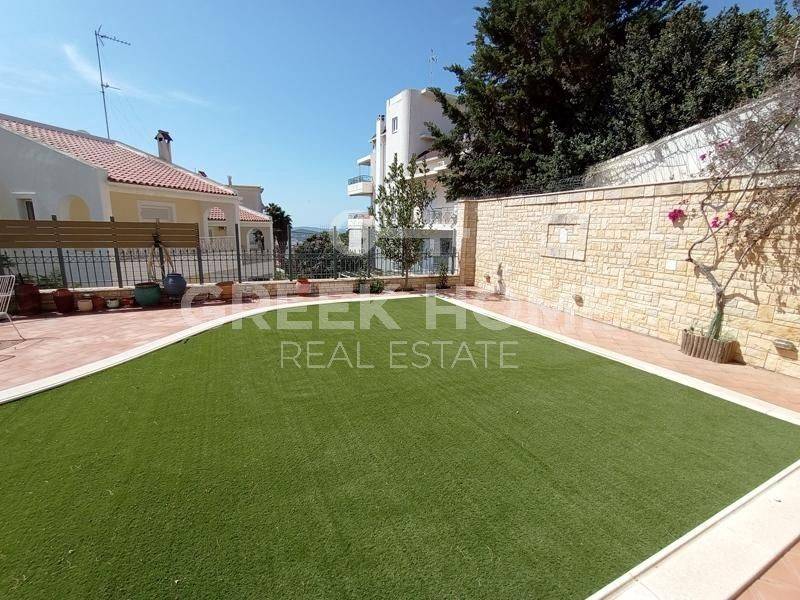 Voula, Panorama - Floor Apartment 160sqm plot 640sqm, bedrooms 3, raised ground floor, excellent condition, year built 2001, energy class D, living room, kitchen, bathroom, wc, heating type: autonomous (oil), parking covered, quiet, dual aspect apartment, luminous, sea view, frontage, painted, storage space 8sqm, solar heater, fireplace, balconies, tents, elevator, garden, garden 240sqm, aluminum frames, double glazed windows, door screen, ceramic tiles floors, secure door, video doorbell, luxurious, private pool, barbeque, internet, pets allowed.