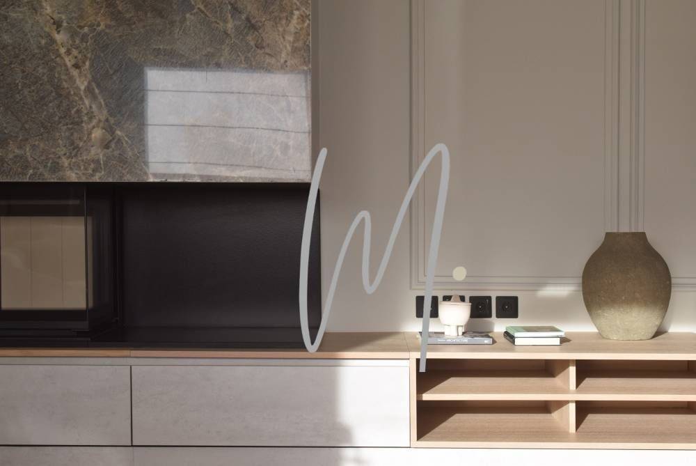 The open, modern kitchen complements a generous living area highlighted by a feature fireplace — perfect for elevated entertaining or tranquil evenings at home. This residence has been fully redesigned and renovated (2022) with attention to every architectural and functional detail, including aluminium double-glazed windows, integrated climate control with heat pump cooling, and stylish contemporary finishes throughout.