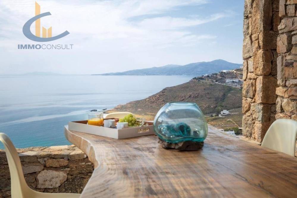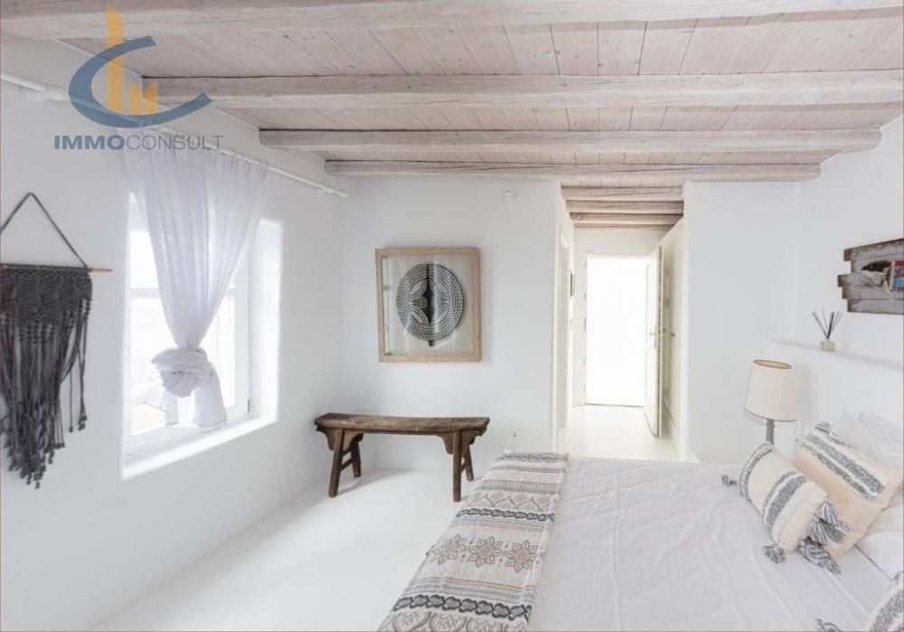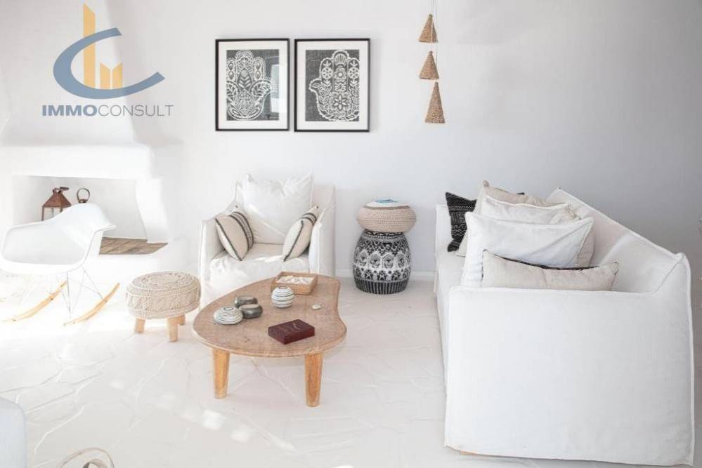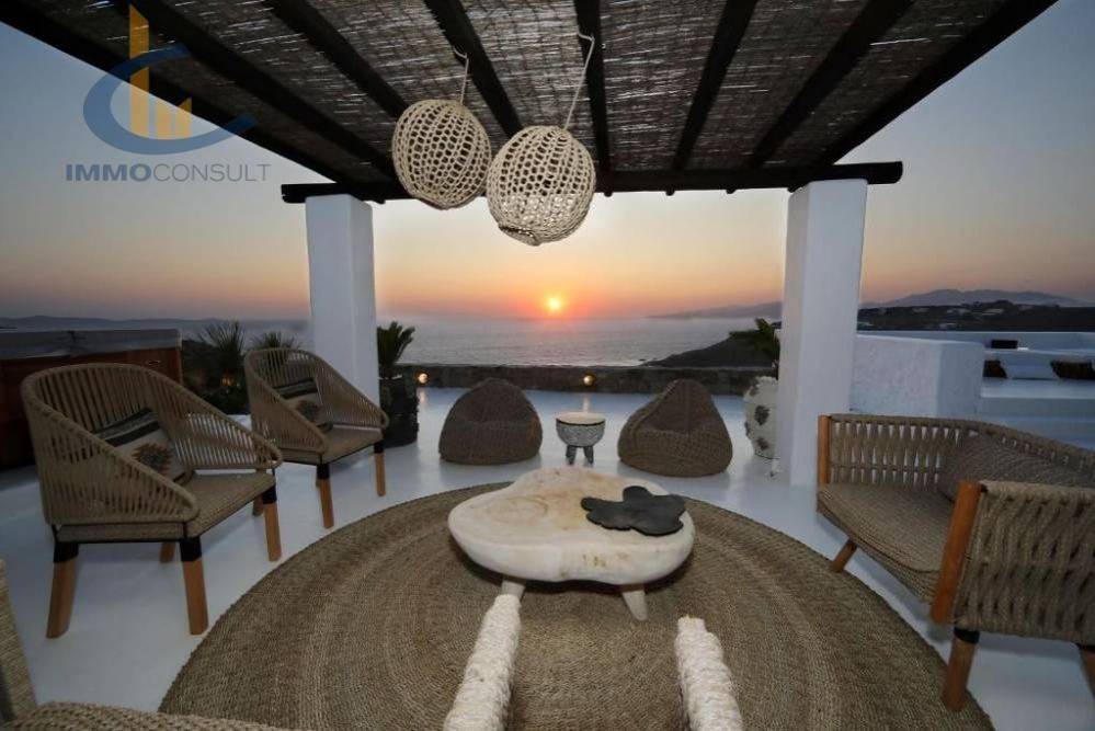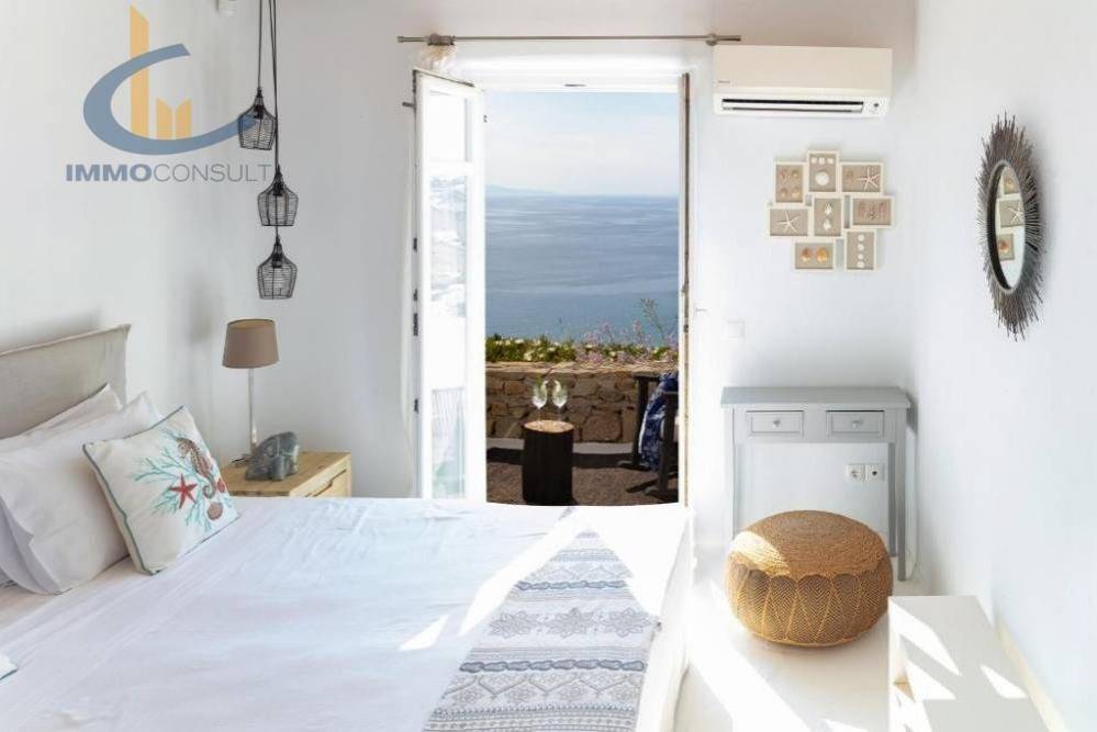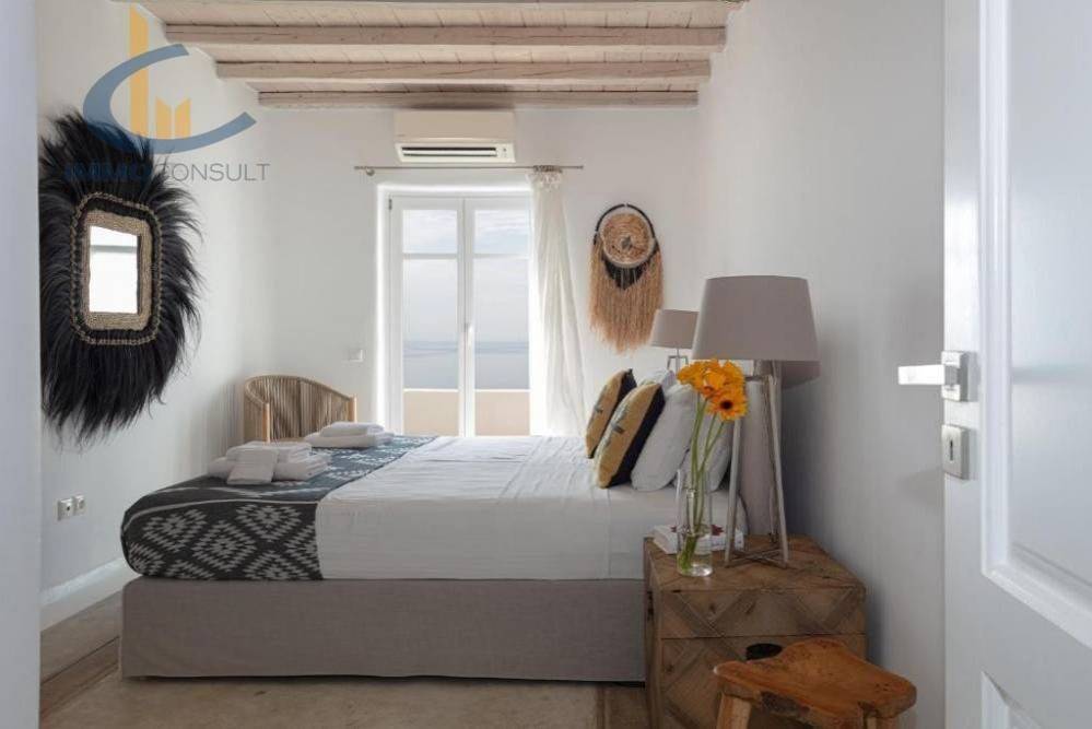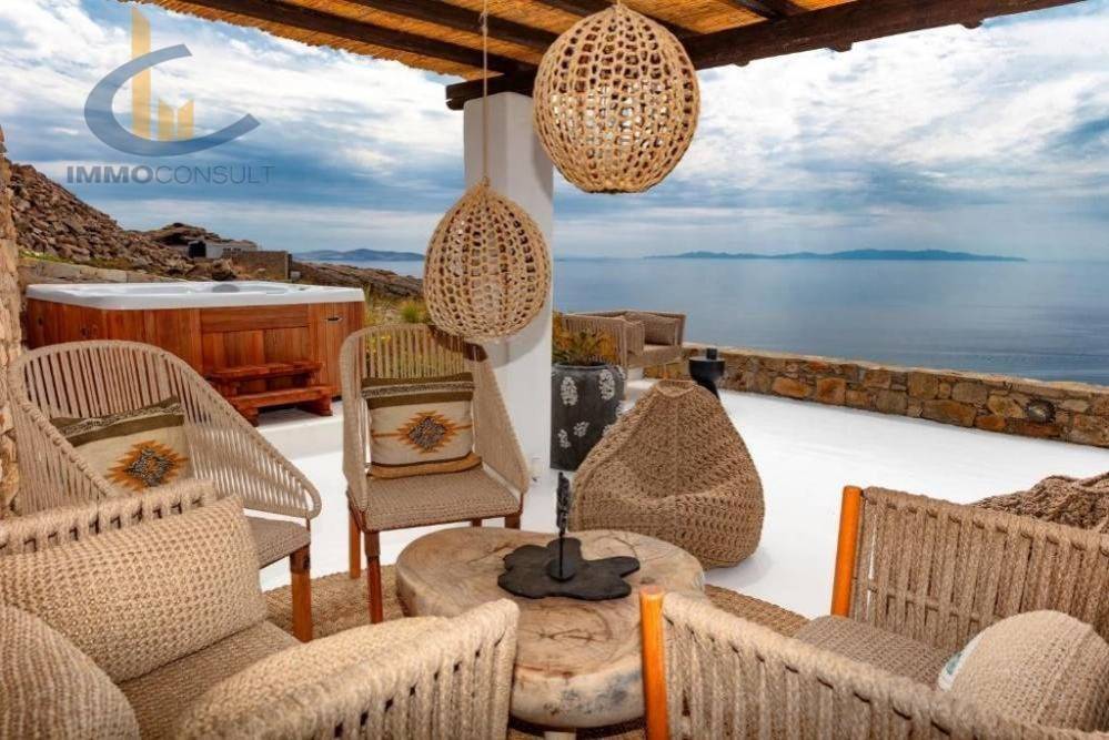 Mykonos, Houlakia: 1.7km. from Agios Stefanos Beach, with panoramic sea view, 150 sq.m. Villa for sale. in a complex of 5 houses, with its own independent entrance and permission for a swimming pool. The Villa has 3 Master bedrooms with a view, living room kitchen with fireplace, terrace with pergola and dining room, its own private terrace with jacuzzi, internal staircase, access to the shared pool, Breathtaking sunset view, shared Parking for the whole complex, garden, air conditioners, rooftop solarium, suite, island style, modern, luxury, available furnished as in photos. It is recommended as a holiday home, but also for an investment with a good return. Price €920,000 | Property Code: #18731