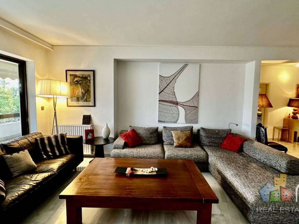 Beautiful, chic 125 sq.m flat on the second floor of a five-storey building, built in 1998, on a very large plot with entrances on two different streets. Located just a few minutes' walk from Holargos metro station, in a neighborhood on the border of Neo Psichiko, close to embassies, cafés, restaurants, cinemas, shops, supermarkets, organic food shops, schools, a swimming pool and tennis courts. The flat comprises an entrance hall leading to the kitchen, bedrooms and living room. The living-dining room is spacious and bright, faces south-west, has a white marble floor, a fireplace and opens onto a lovely terrace overlooking the large garden and a quiet street. The kitchen is separate but has a connecting pass-through to the living room and a balcony, the three bedrooms have balconies and built-in wardrobes and two of them have solid parquet flooring. The master has its own en-suite bathroom and the other two bedrooms share another bathroom with window and bath. The flat has a parking space under the building's pilings and a large cellar in the basement. It was partly renovated in 2019. Independent gas heating, double glazed windows, sliding shutters, awnings, security door, water heater with solar panel, 2 air conditioning units and large balconies - terraces.. Mobilia Real Estate, contact phone: 2107563200, 2107563202, email: info@mobilia.gr, website: www.mobilia.gr