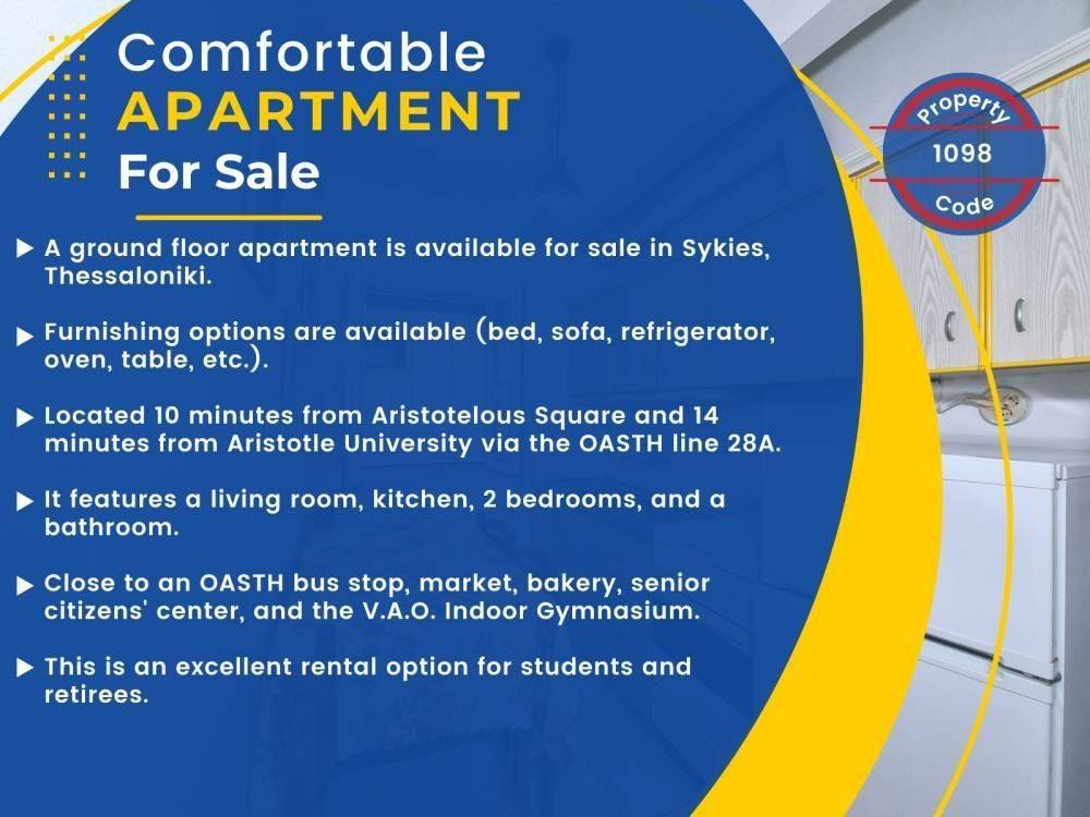 ▶ Apartment for sale in Sykies, Thessaloniki, with furnishing options available.