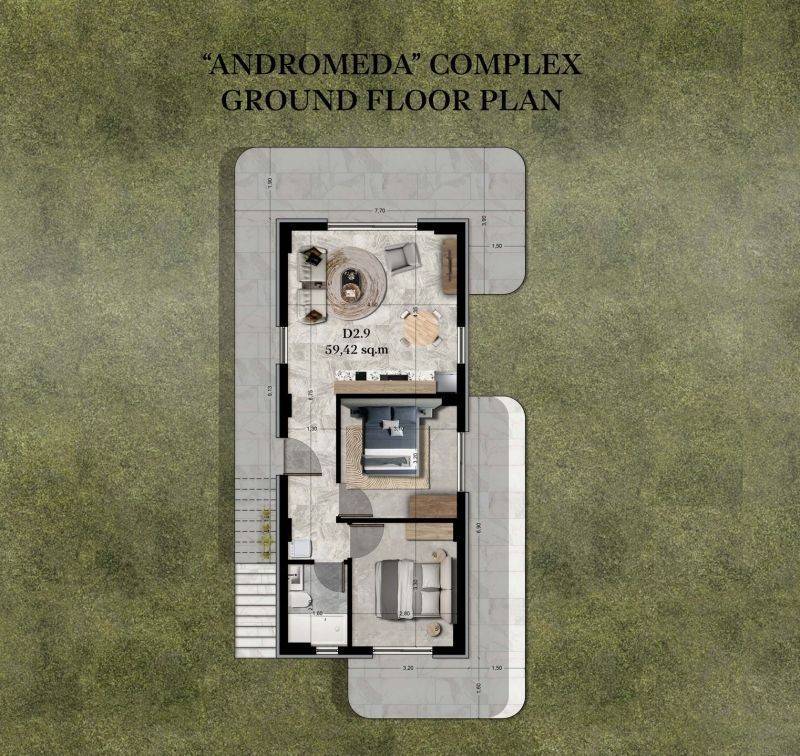 • 1 Floor Apartment 59.42sqm, consisting of living room kitchen with kitchen, 2 bedrooms, 1 bathroom.