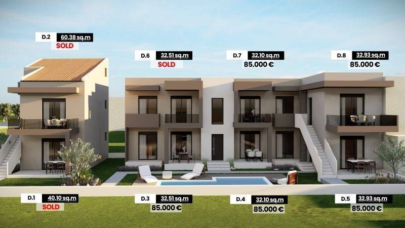 Property Code: 1-241 – Ofryniou Beach FOR SALE: Residences in the luxurious seaside development Astycrateia Complex, just a few steps from the beach, in the heart of Ofryniou Beach. The complex consists of 8 modern, high-aesthetic homes with clean architectural lines that combine elegance and functionality. It includes 4 ground floor apartments ranging from 32.09 sq.m to 40.03 sq.m with open-plan living room and kitchen, one bedroom, and a bathroom. 3 first-floor apartments from 32.09 sq.m to 32.93 sq.m with the same layout. 1 duplex apartment with an attic of 60.07 sq.m, where the first floor includes the living room with kitchen, one bedroom, and bathroom, and an internal staircase leads to a second bedroom in the attic. Prime location: only 50 meters from a supermarket and very close to a bakery and fish market, offering direct access to all essential services and amenities. Delivered with: