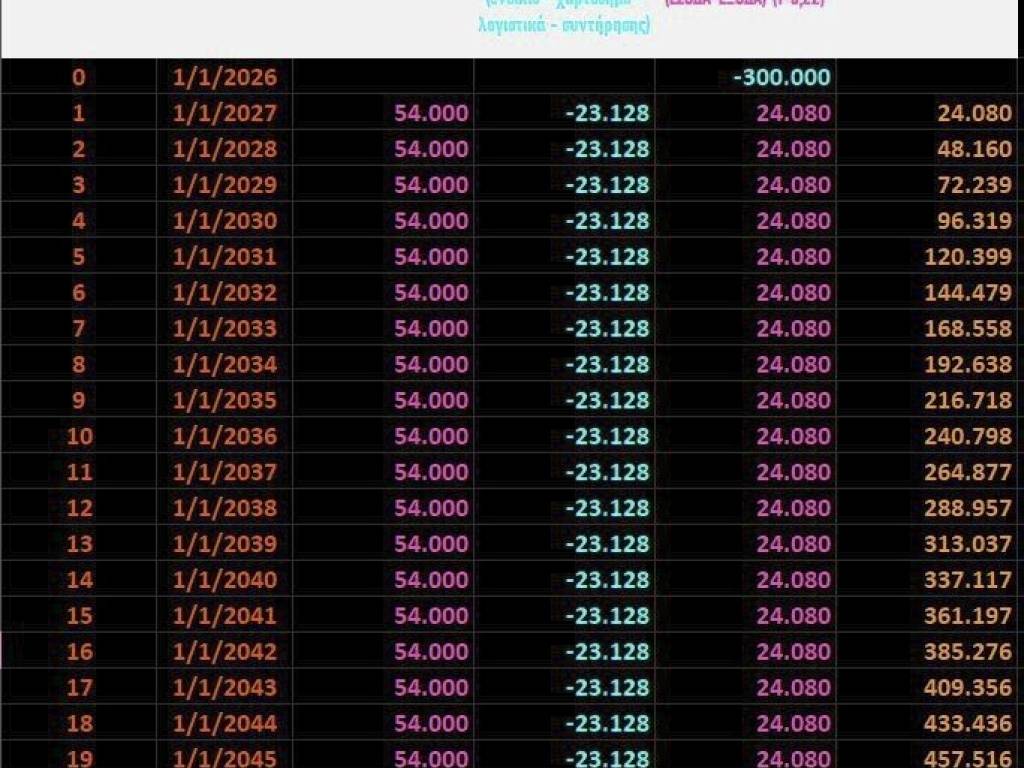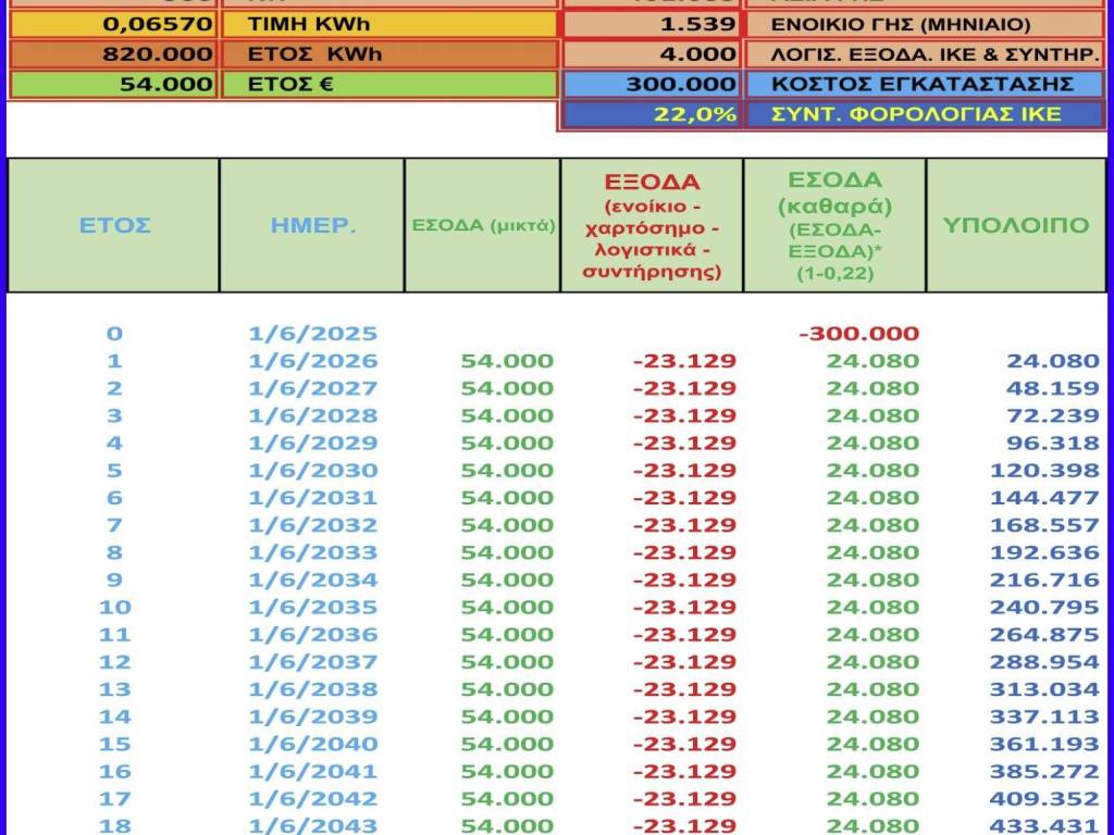 Ενοικιάζεται γεωτεμάχιο 9,5 στρεμμάτων επί της οδού Αμπελώνος, σύμφωνα με το οποίο: α) Για 9,5 στρέμματα γεωτεμάχιο κατασκευάζεται φωτοβολταϊκό πάρκο 500kw που αποδίδει 820.000 kwh ανά έτος. β) Αποδίδει ετήσια έσοδα 54.000 ευρώ. γ) Έξοδα κατασκευής 300.000 ευρώ. δ) Έξοδα ενοικίου 19.133 ευρώ ανά έτος (συμπερ. χαρτόσημο 3,6%). ε) Έξοδα λογιστικά (ΙΚΕ) και συντηρήσεως 4.000 ανά έτος. στ) Φορολογικός συντελεστής 22%. Συνολικά καταβάλλονται 300.000 ευρώ (έξοδα κατασκευής) και λαμβάνονται 481.000 ευρώ στην 20 ετία (καθαρά) που μεταφράζεται σε απόδοση κεφαλαίων 5,00%. Που αλλού υπάρχουν τέτοιες αποδόσεις στην Ευρωζώνη ή στην Ελλάδα? Τέτοιες αποδόσεις (με πληρωμένους τους φόρους), ούτε οι τράπεζες με τα στεγαστικά δάνεια δεν επιτυγχάνουν. Επιπλέον, οι τράπεζες αναλαμβάνουν και το ρίσκο να κοκκινίσουν όλα σχεδόν τα εκχωρημένα δάνειά τους, εάν ανέβει ένας βαρβάτος κουμμουνισμός στην εξουσία και μηδενιστούν άπασαι αι αξίαι των γεωτεμαχίων εις την χώραν. Η τιμή του ενοικίου είναι αδιαπραγμάτευτη.