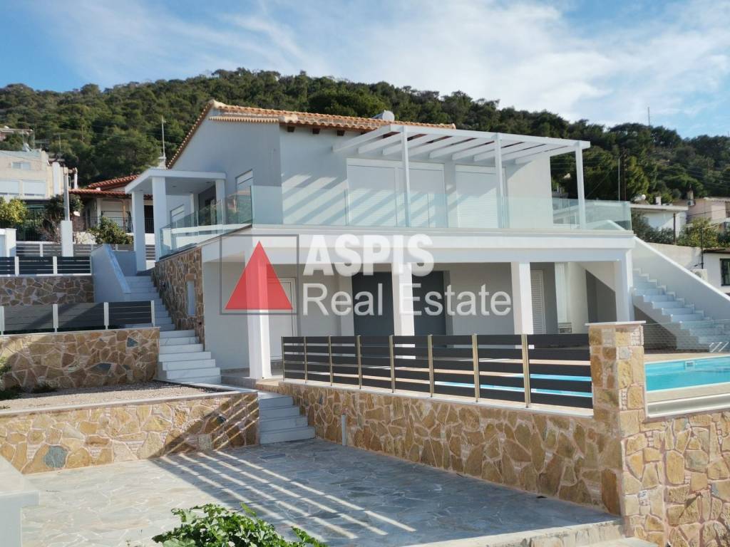 Salamina, Agios Athanasios, Detached house For Sale, 143 sq.m., In Plot 800 sq.m., Property Status: Amazing, Floor: Ground floor, 3 Bedrooms 1 Kitchen(s), 2 Bathroom(s), 1 WC, Heating: Personal - Petrol, View: Sea view, Building Year: 2023, Energy Certificate: A, Floor type: Tiles, Type of door frames: Aluminum, Features: Security alarm, CCTV, Storage room, Satellite Receiver, Internet Line, Double Glazed Windows, Window Screens, Balconies, BBQ, Pets Allowed, AirConditioning, Solar water system, Swimming pool, Back yard (Garden), New Construction, Painted, Suitable for Commercial Use, Price: 390.000€. Aspis Real Estate Σαλαμίνας