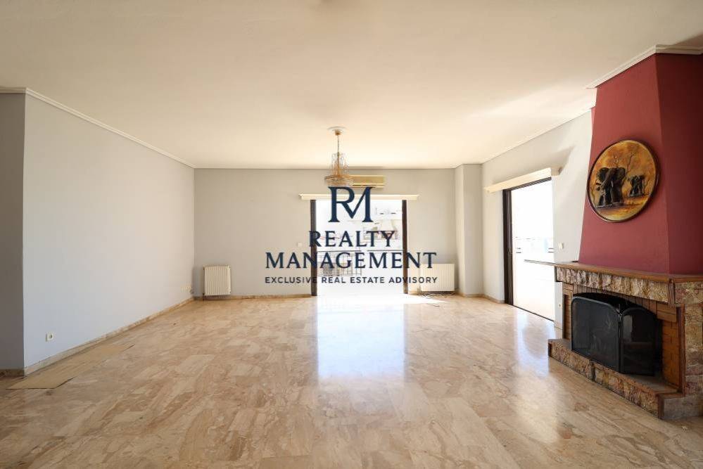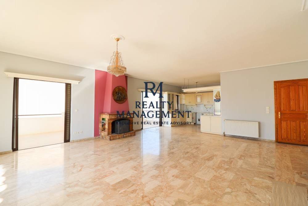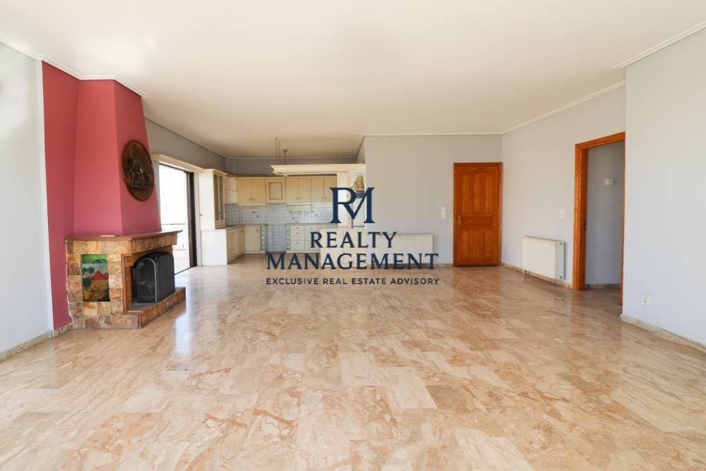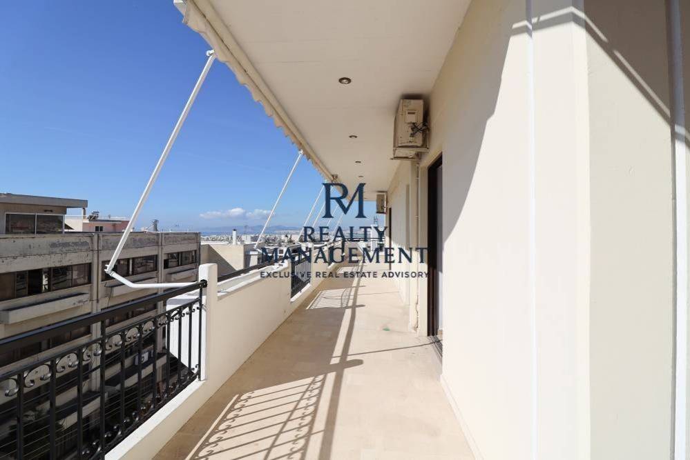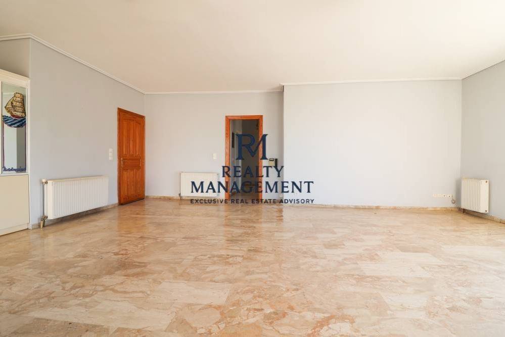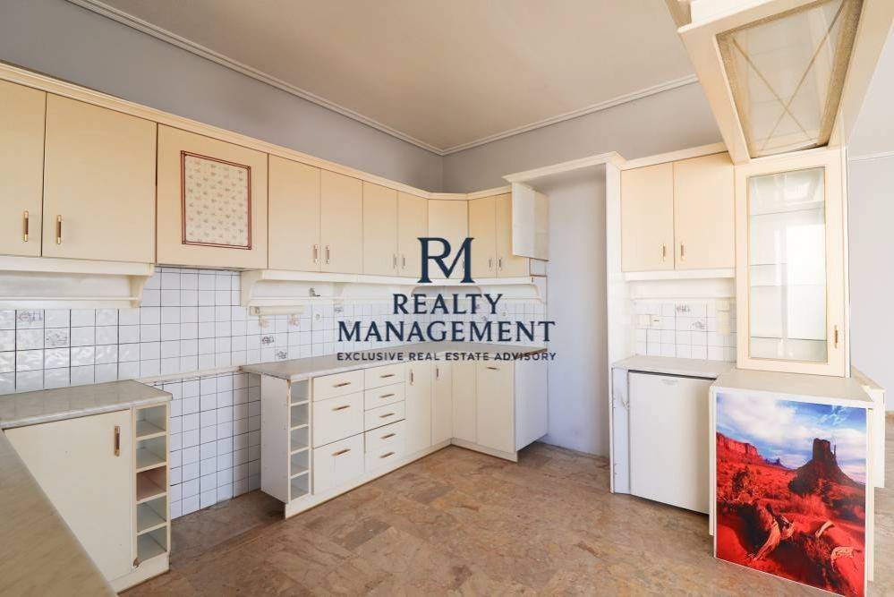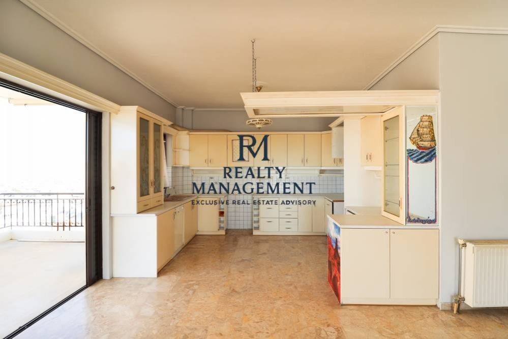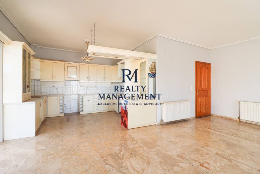 Occupying the entire 3rd floor, this front-facing, dual-aspect 131 sq m apartment is filled with natural light and offers a well-balanced layout. Accommodation includes three comfortable bedrooms, a separate kitchen, a generous reception with fireplace, a family bathroom and a separate WC for everyday convenience. Features comprise independent natural gas central heating, aluminium window frames, a security door, air conditioning, marble flooring and a solar water heater. The property enjoys rare, far-reaching views towards the Acropolis, Piraeus and the Saronic Gulf—an elevated outlook that lends distinction to daily living. A quality home with character, ideal for a family or couple seeking space, light and privileged vistas.