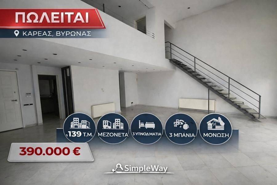 Vyronas, Kareas - Maisonette 139sqm bedrooms 2, master bedrooms 2, levels 2, 1st - 2nd, year built 1998, energy class C, living room, kitchen, 3 bathrooms, wc, heating type: autonomous (natural gas), quiet, luminous, storage space, fireplace, balconies, large balconies, tents, aluminum frames, double glazed windows, marble floors, secure door, residential zone.