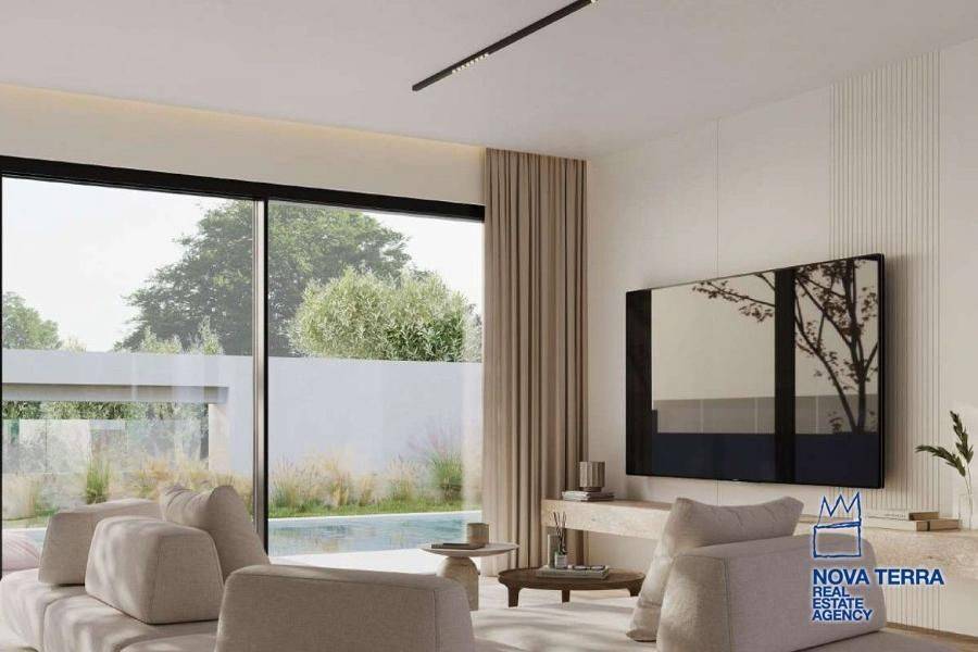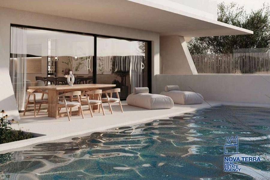 GLYFADA - EXONI, Duplex / Triplex Apartment,, Sale, 198 sq.m, on a plot of 345 sq.m, year built 2025, 4 rooms, Ground Floor, 1st, Various Characteristics: Balcony, Bath (4), Escalator, Fire Place, Garden, Kitchen, Living room, Store Room, Swimming Pool, Toilet (2), Master Bedrooms: 4 Master Bedrooms, Flooring: Wooden floor, Heating: Floor heating, Heating pump, Access road, Aluminium panels, Bright, Double-glazing, Facade, From Side to Side, Luxury, Minimal, Newly built, Night charge, Painted, Residential area, Security Alarm, Security Door, Solar Heating, In perfect condition: Pets allowed: Satellite dish: Parking area: Garage (2), Energy class: Α+. property ID: 51642, www.nova-terra.gr