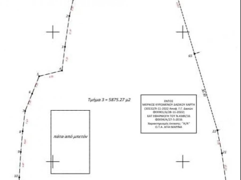 Χαρακτηριστικά: Εκτός σχεδίου, περιφραγμένο, ελάχιστα επικλινές, συντελεστής κάλυψης: 0.10. Διαθέτει πρόσοψη 37.28 μέτρα σε ασφαλτοστρωμένη Αγροτική οδό πλάτους 4μ και βάθος περίπου 104μ.